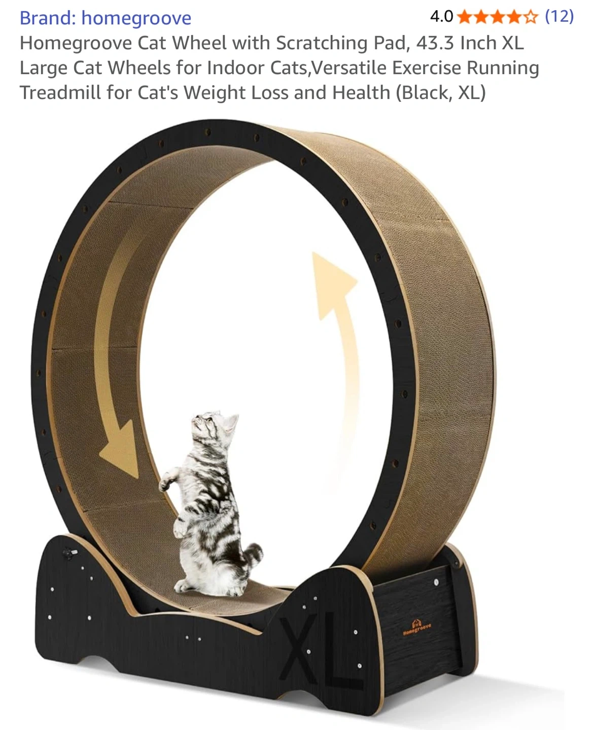 Keep your cat active and healthy with this Homegroove cat wheel! It features a scratching pad and is an XL size, perfect for indoor cats. It's a versatile exercise running treadmill designed for your cat's weight loss and overall health. Colour is black.
