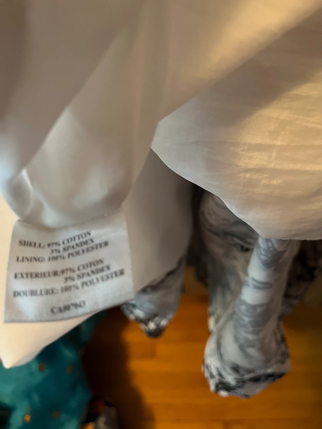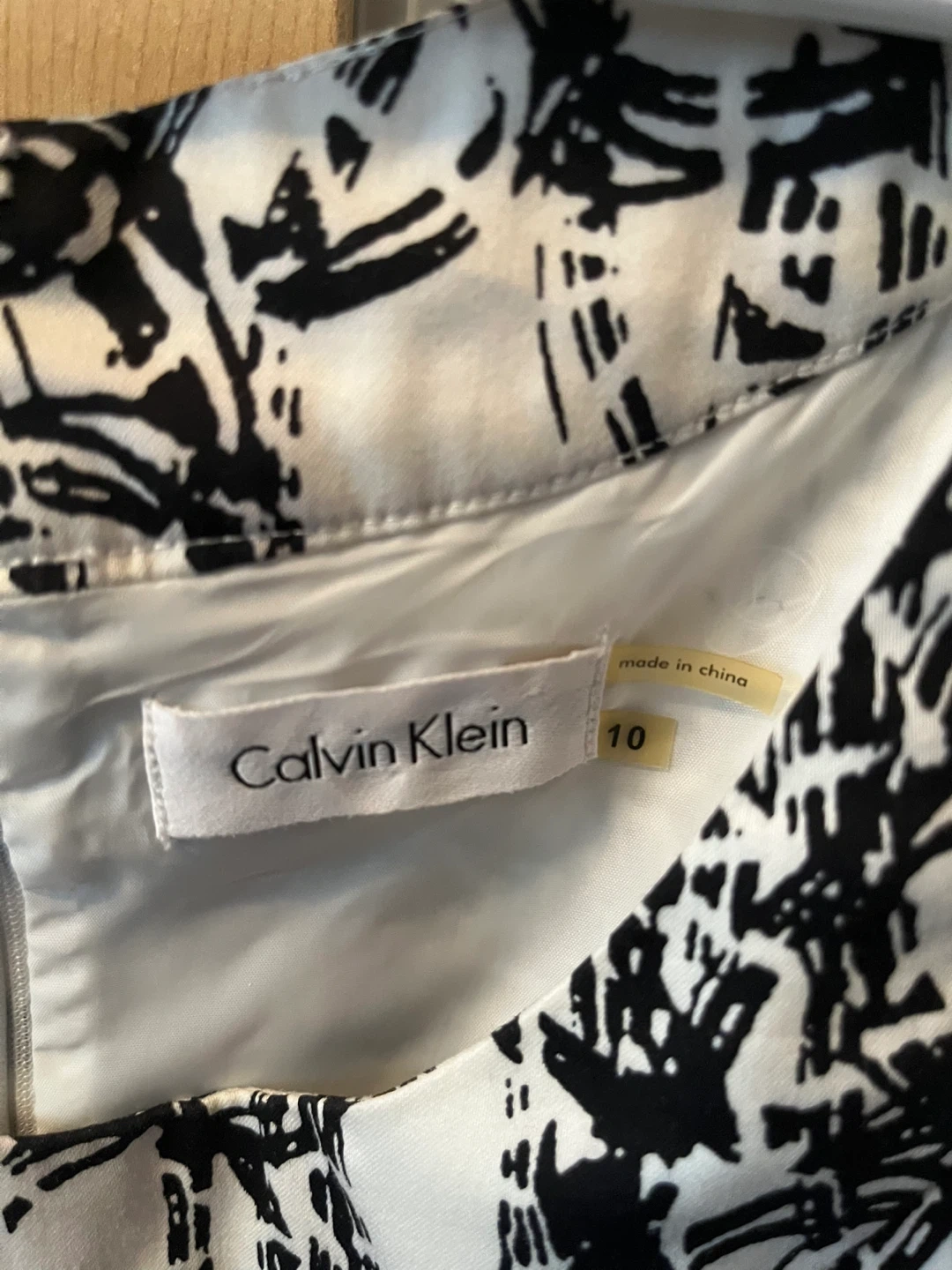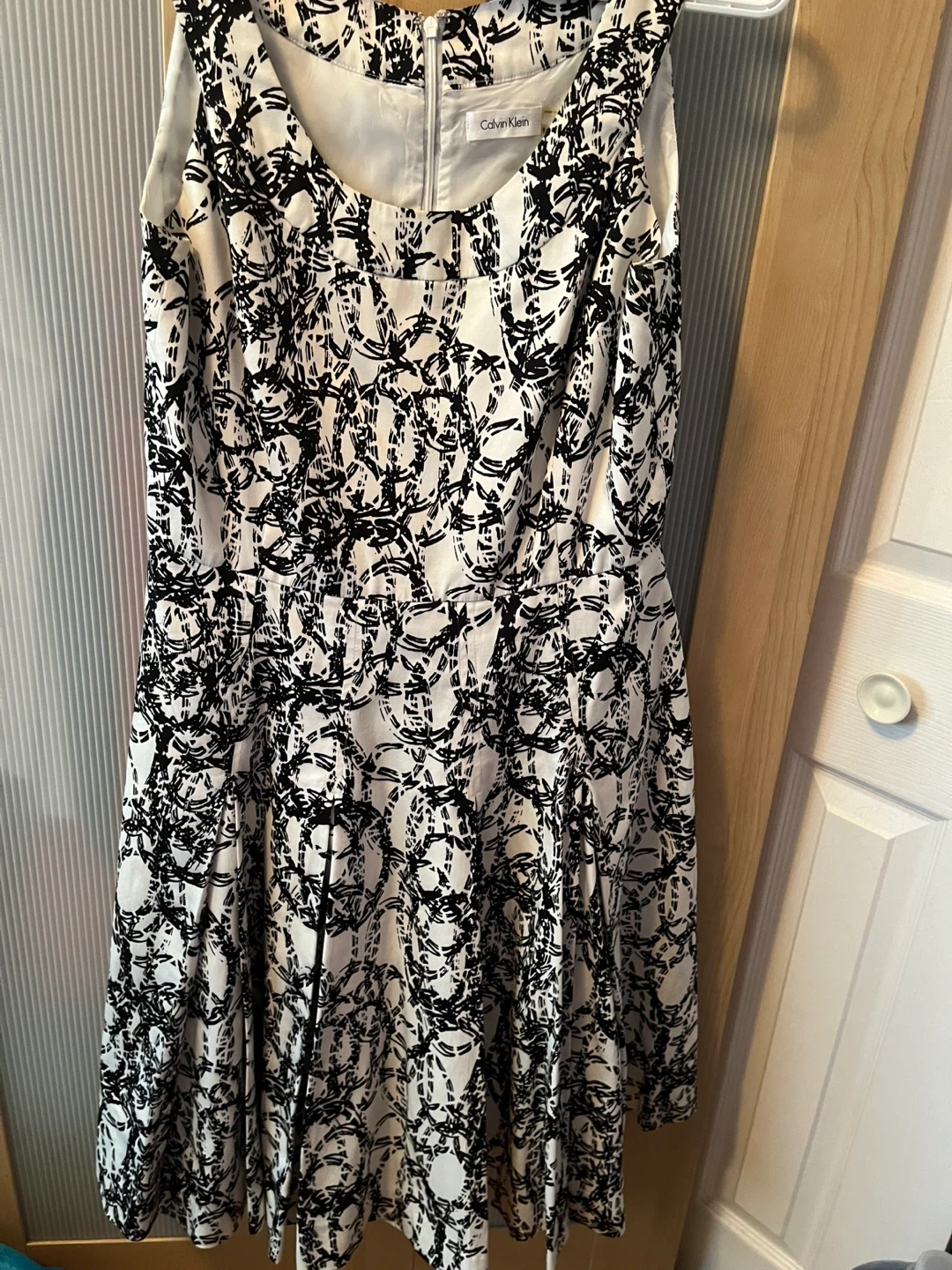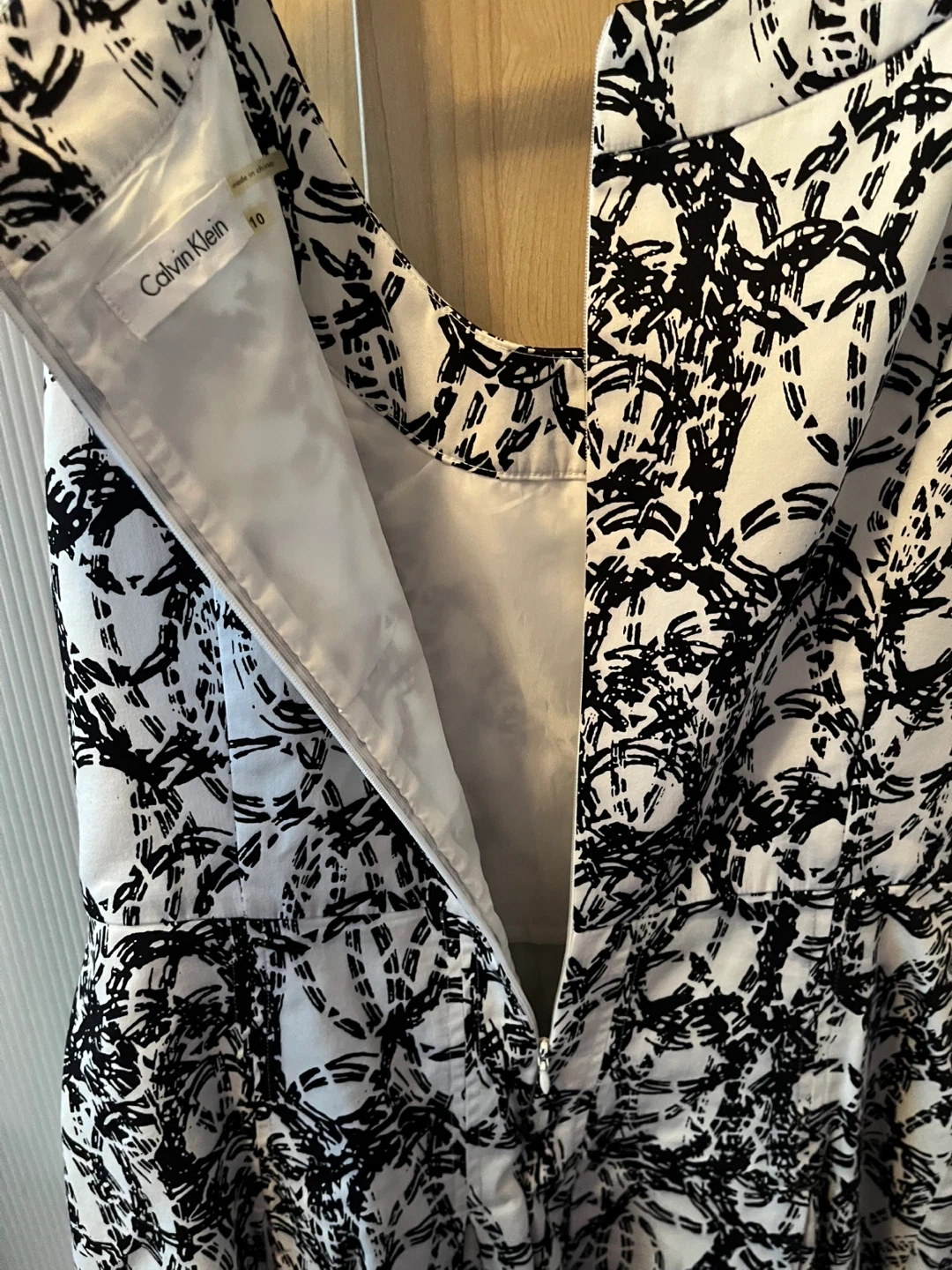 Selling a Calvin Klein dress in size 10. The dress is white with a black pattern. It has a white lining, a pleated skirt, and a flattering fit. It's in good condition and ready for a new home! Glendale SW area. Available if the ad is still up.