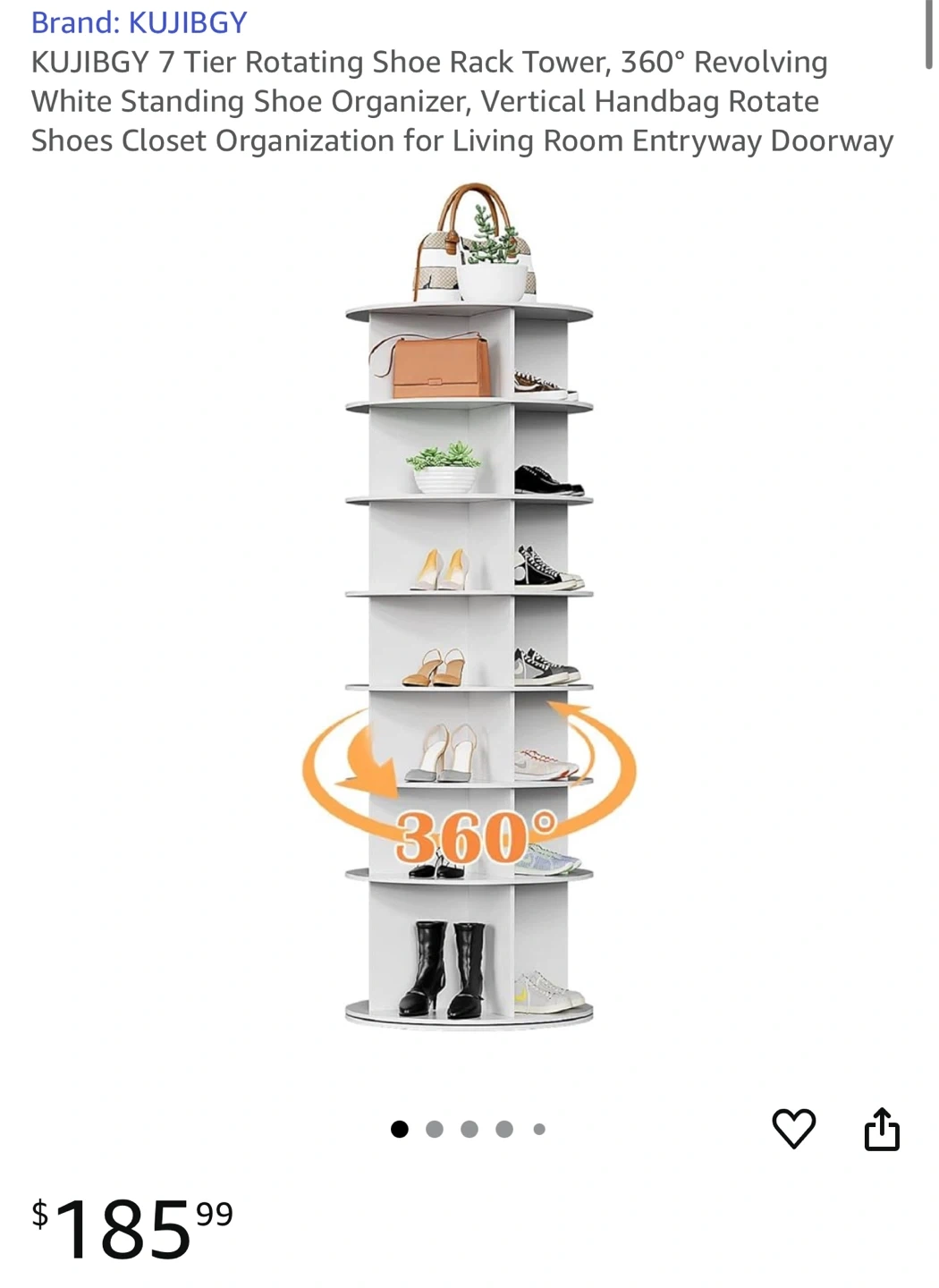 This is a KUJIBGY 7 Tier Rotating Shoe Rack Tower. It's a 360° Revolving White Standing Shoe Organizer, perfect for vertical handbag and shoe closet organization in your living room, entryway, or doorway. Originally priced at $185.99 asking $150 OBO as it’s brand new in box