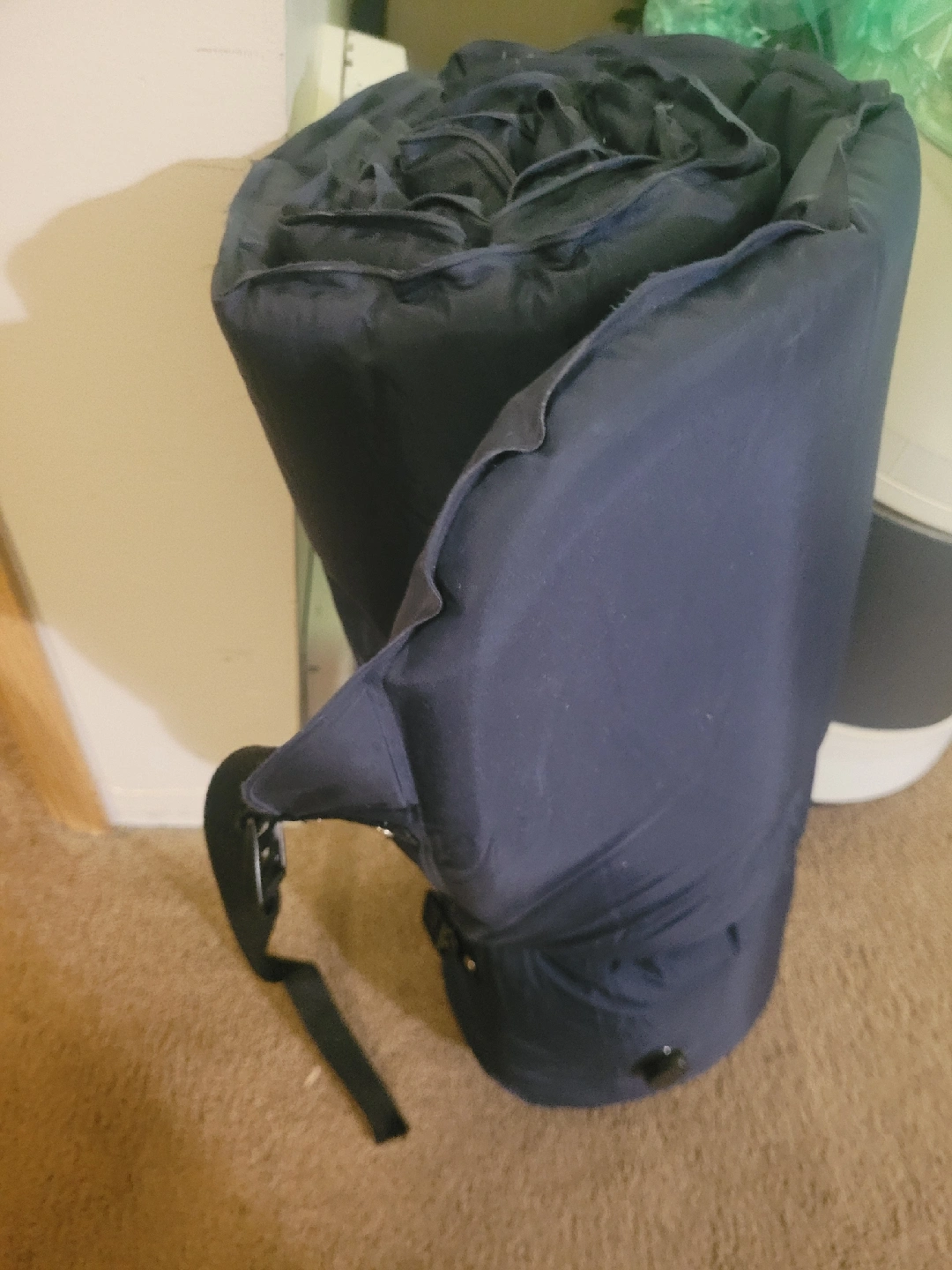 31Self inflating single mat , was bought for hiking. It's a dark blue colour and rolls up for easy storage and portability perfect condition fairly light weight. used only once.. extremely durable outdoor material
