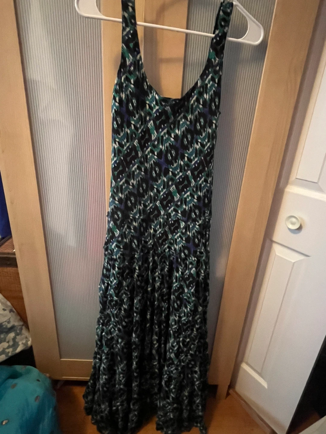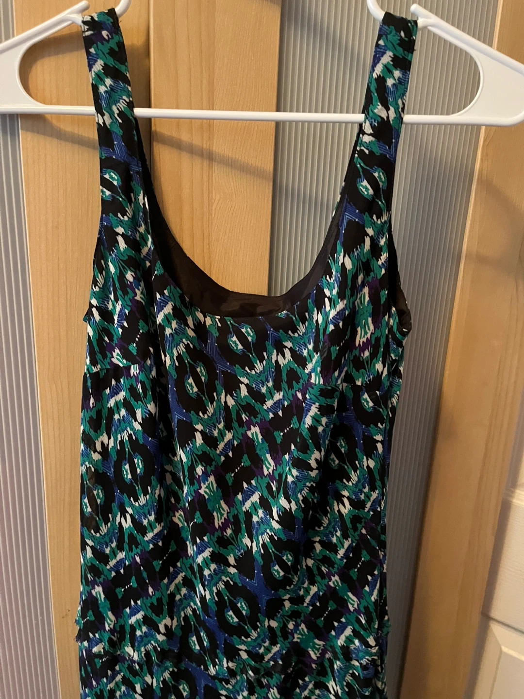 Selling a Jones New York sleeveless long dress in size 6. It features a stylish pattern with black, green, blue, purple and white accents. Perfect for any occasion! Available if ad is up. Glendale SW area