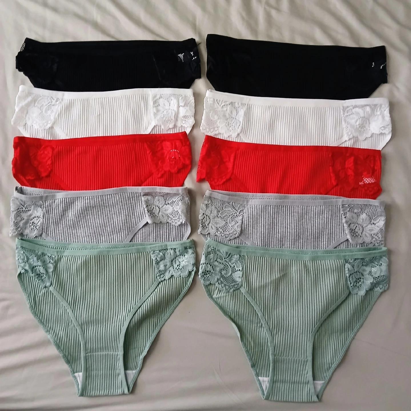 Selling a set of five ribbed panties with delicate lace detailing. You'll get 2 each in black, white, red, gray, and a soft green color. 95% cotton, 5% spandex.