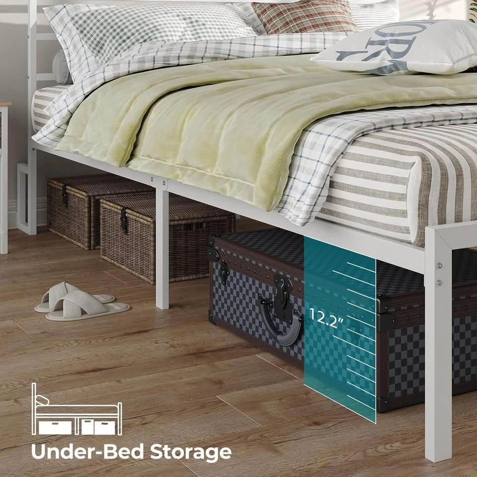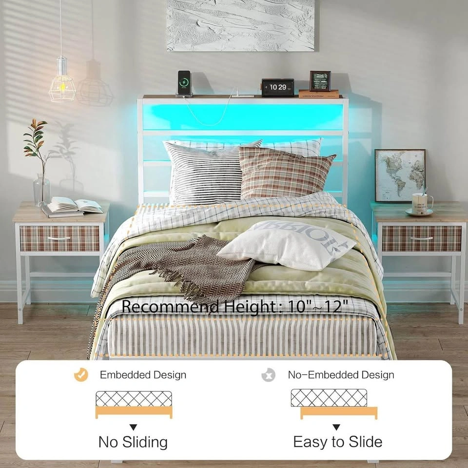 Twin/Single metal platform bed with headboard and footboard. Headboard features LED light and storage shelf.