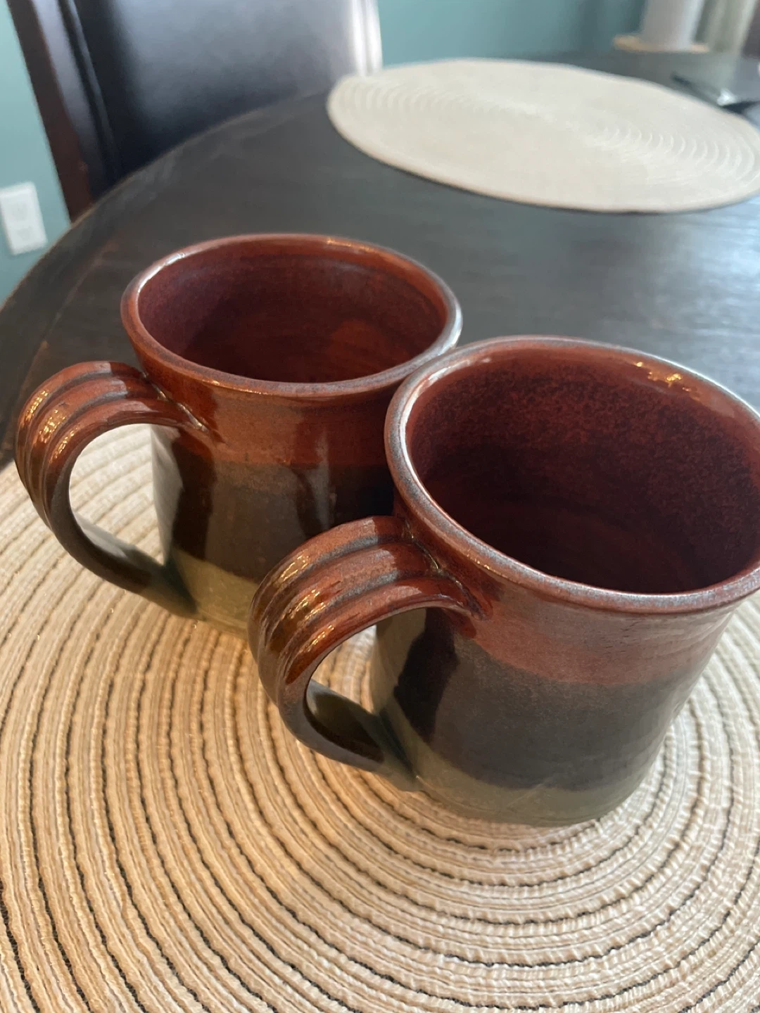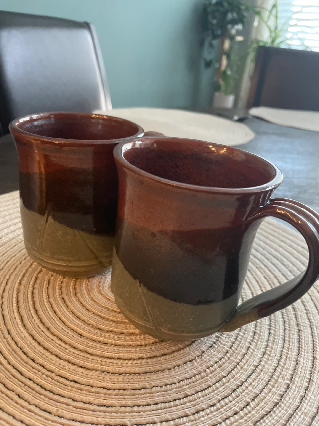 Selling a set of two handmade ceramic mugs! They feature a unique three-tone design in brown, dark brown, and green. Perfect for enjoying your morning coffee or tea! They are in great condition and ready for a new home