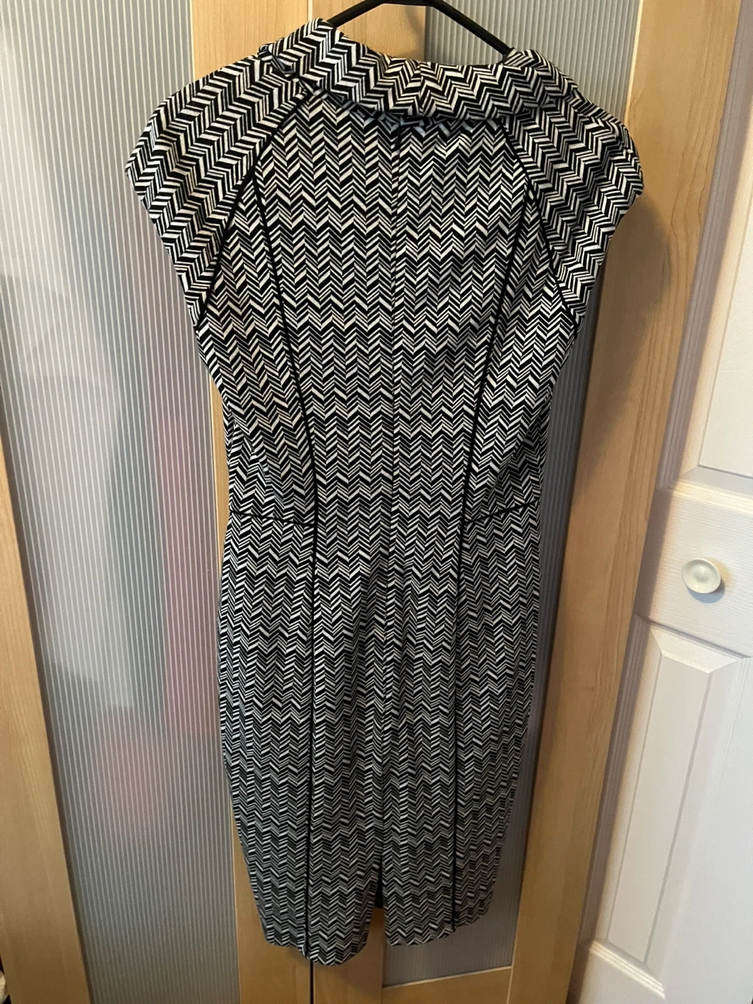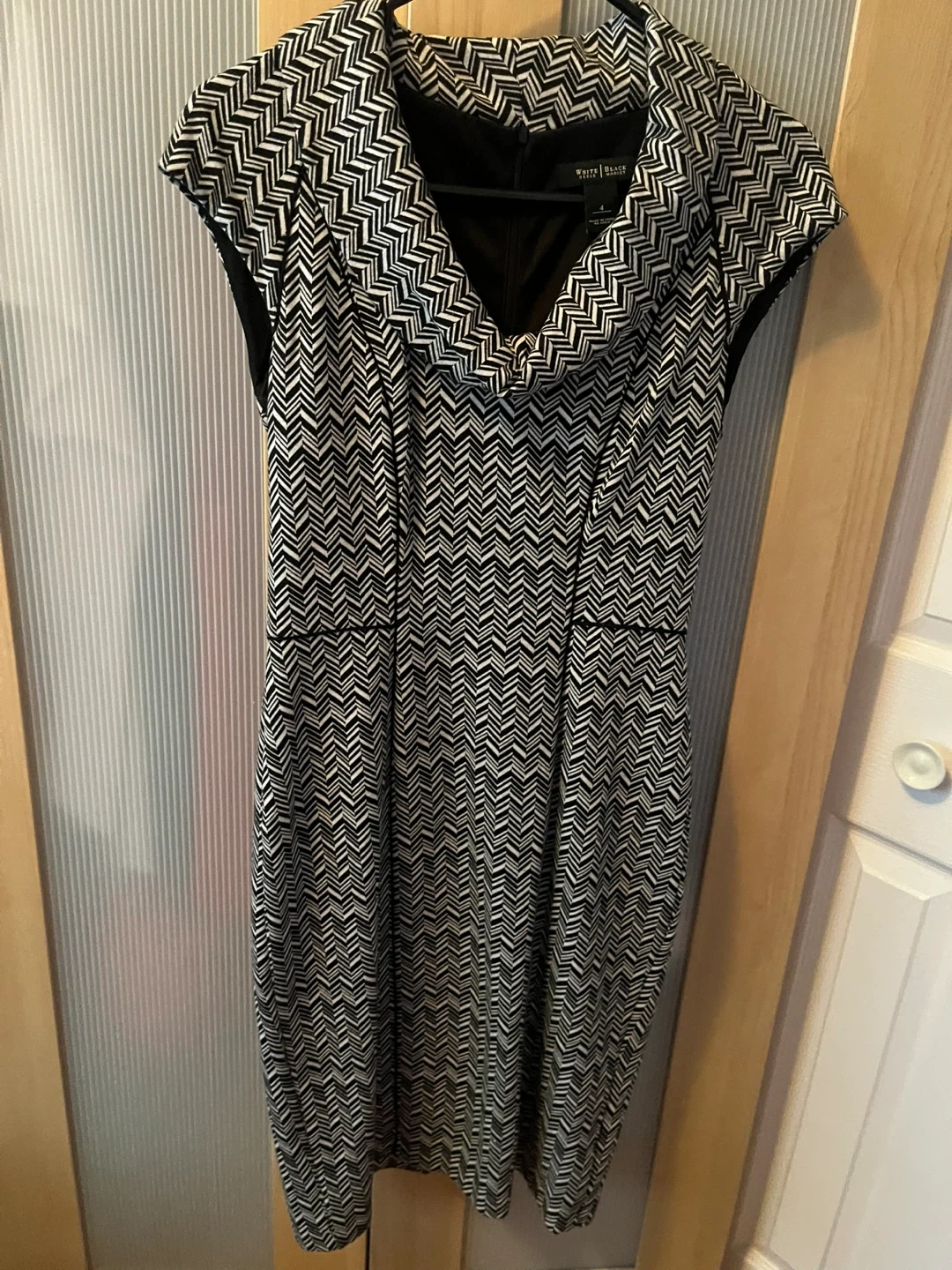 Selling a White House Black Market dress in size 4. It features a striking black and white chevron pattern, a flattering fit, and a cowl like neckline. Glendale SW area. Available as long as ad is running.