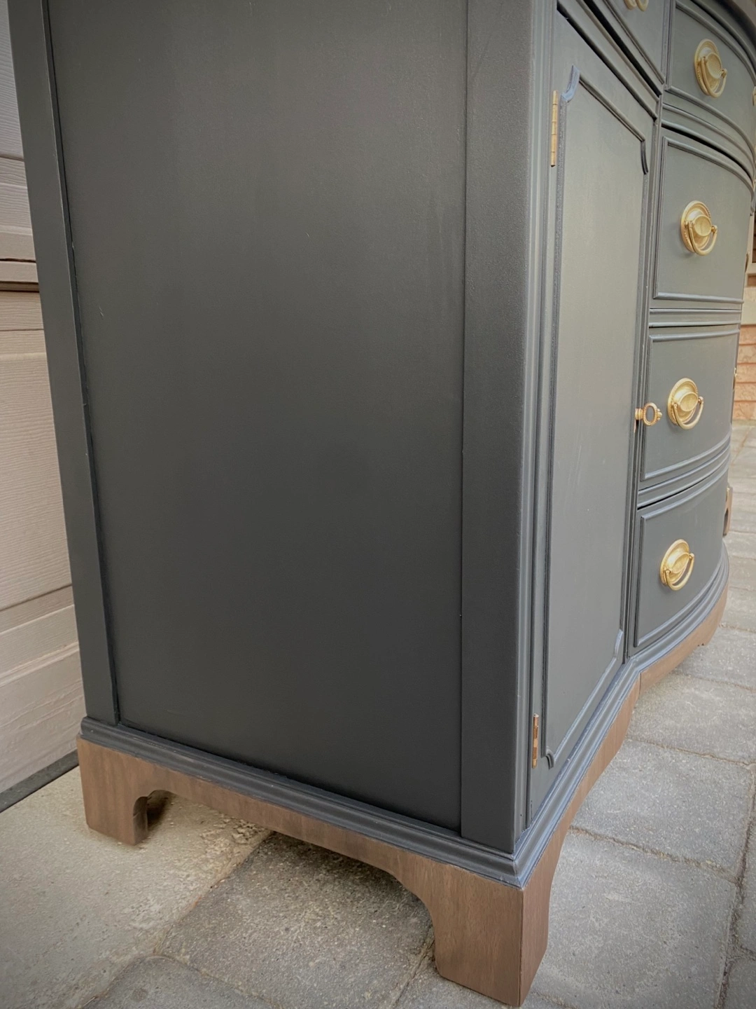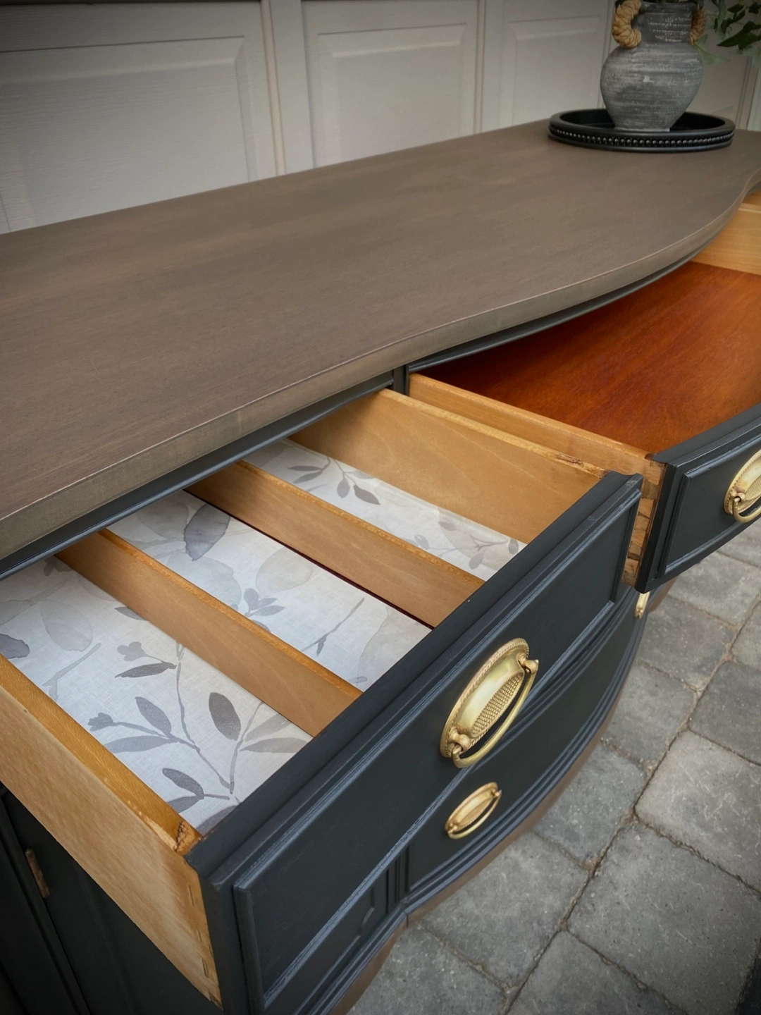 With a spacious bow-front center of drawers and two side cabinets, this sideboard offers ample storage while doubling as a striking statement piece. Perfect for use as a dining room buffet, entryway console, or living room credenza.