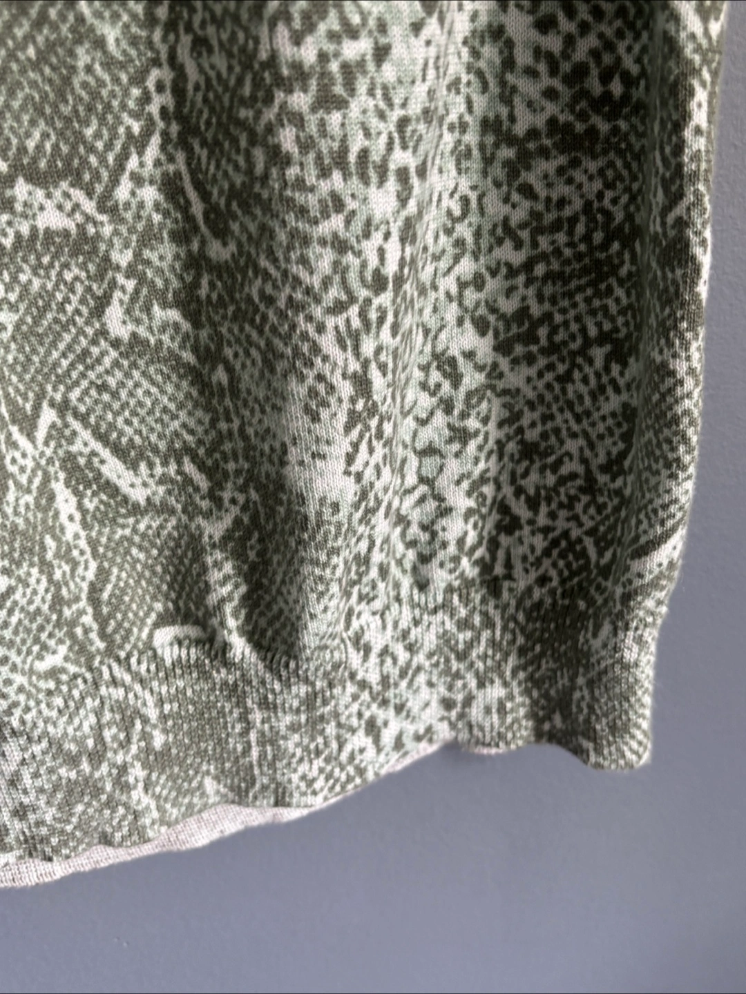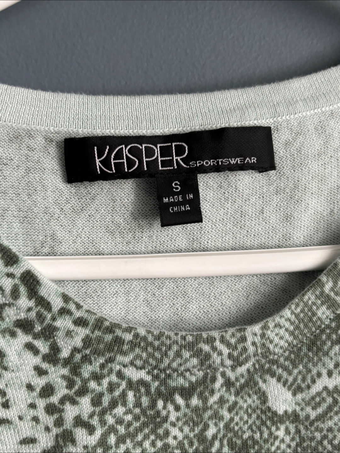 Selling a Kasper Sportswear top in size small. It features a unique snakeskin-like pattern in shades of green and white. Great for adding a bit of flair to your wardrobe!