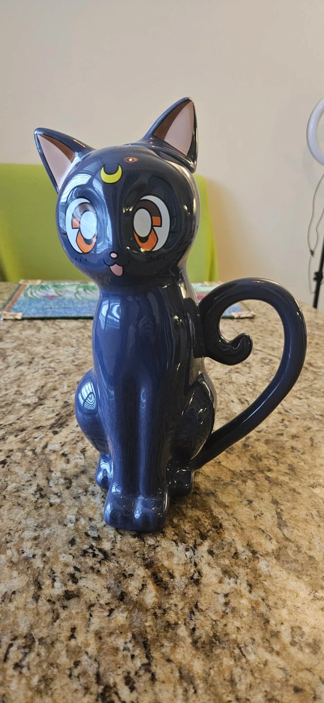 This dark blue ceramic mug is shaped like Luna from Sailor Moon. It's got a fun design and a unique tail handle. Perfect for any fan's collection!
