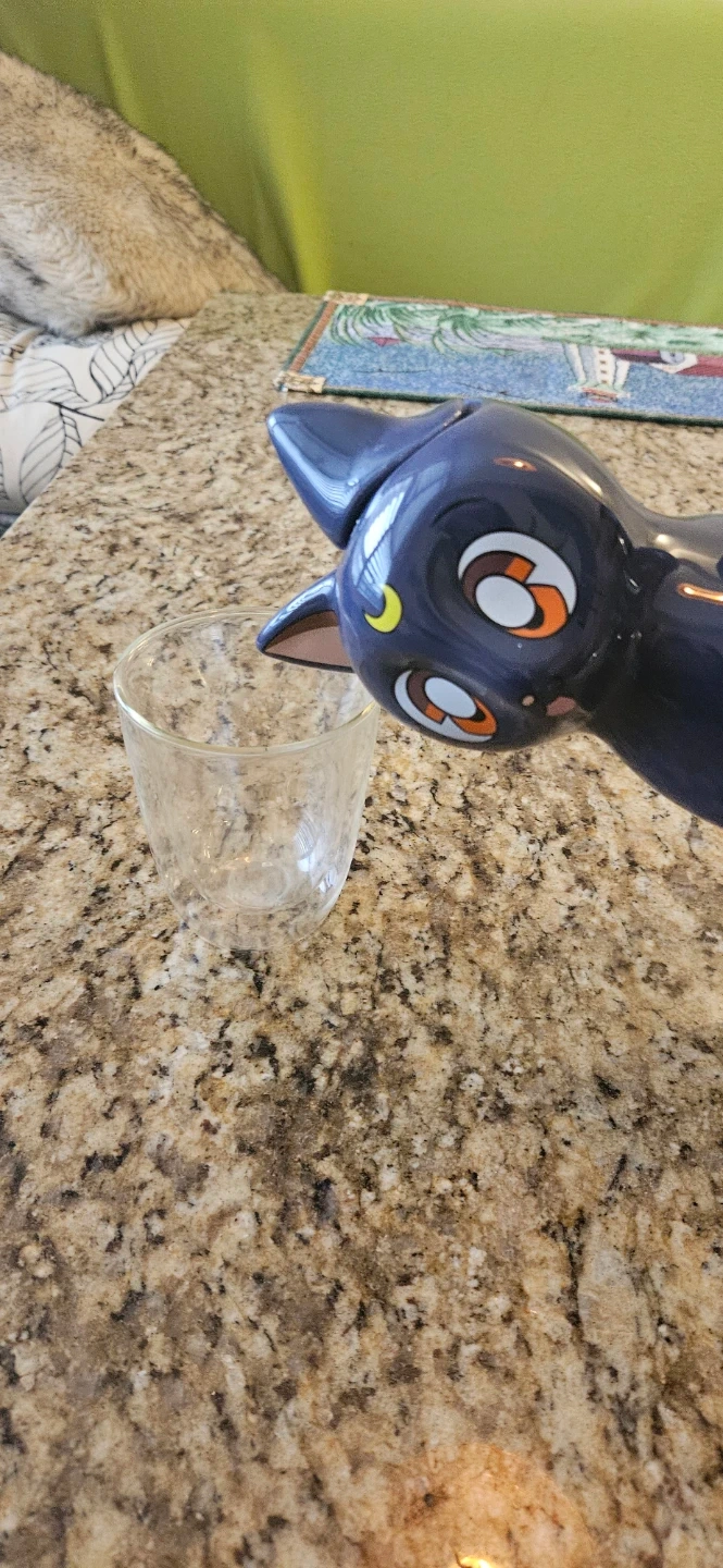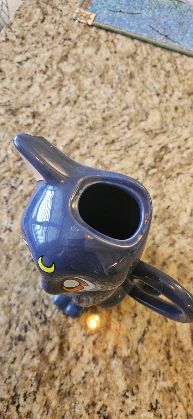 This dark blue ceramic mug is shaped like Luna from Sailor Moon. It's got a fun design and a unique tail handle. Perfect for any fan's collection!