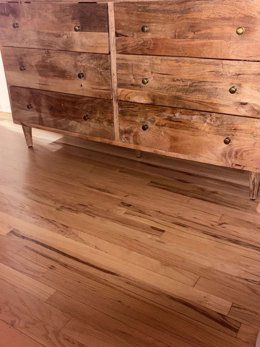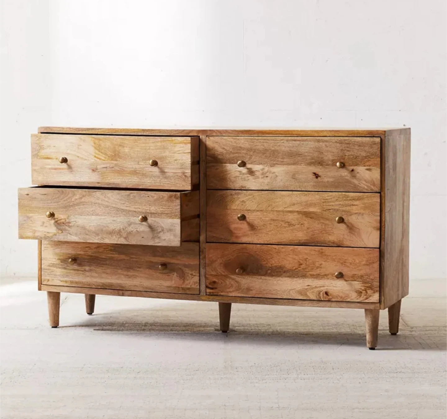 Selling a lovely wooden dresser with six drawers from Urban Outfitters. It's a great piece for adding storage and style to any bedroom. The wood grain is beautiful and the brass knobs add a touch of elegance