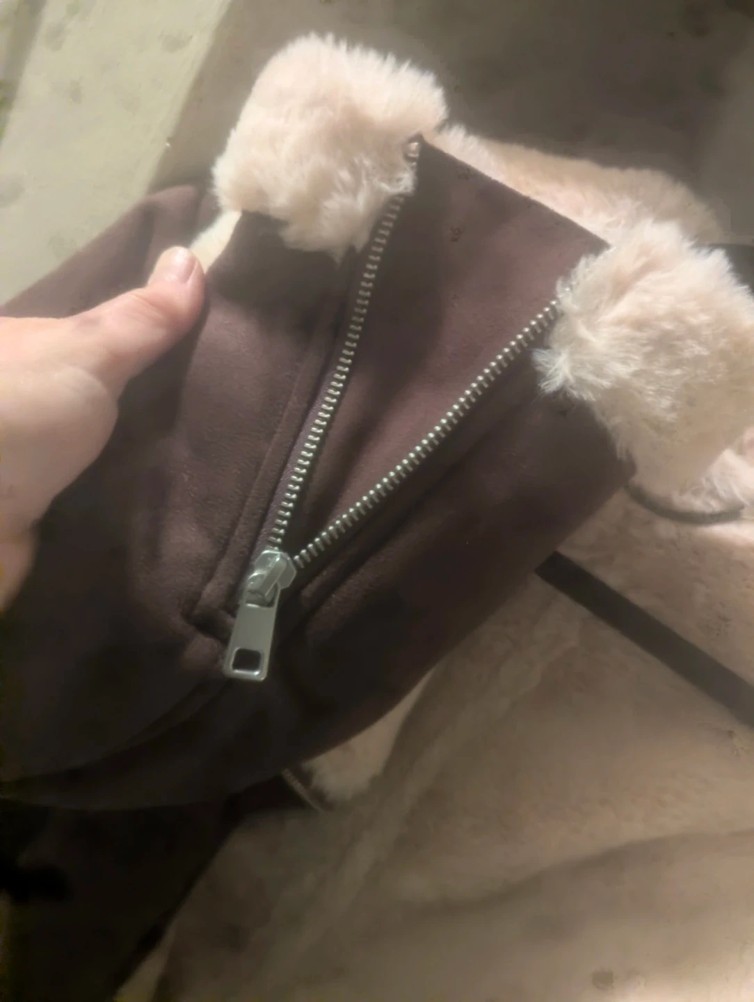 Warm aviator jacket in a rich brown faux suede. It features a soft cream faux fur lining on the collar and cuffs. Zipper closure with two zippered pockets. It's a stylish and cozy outerwear option.