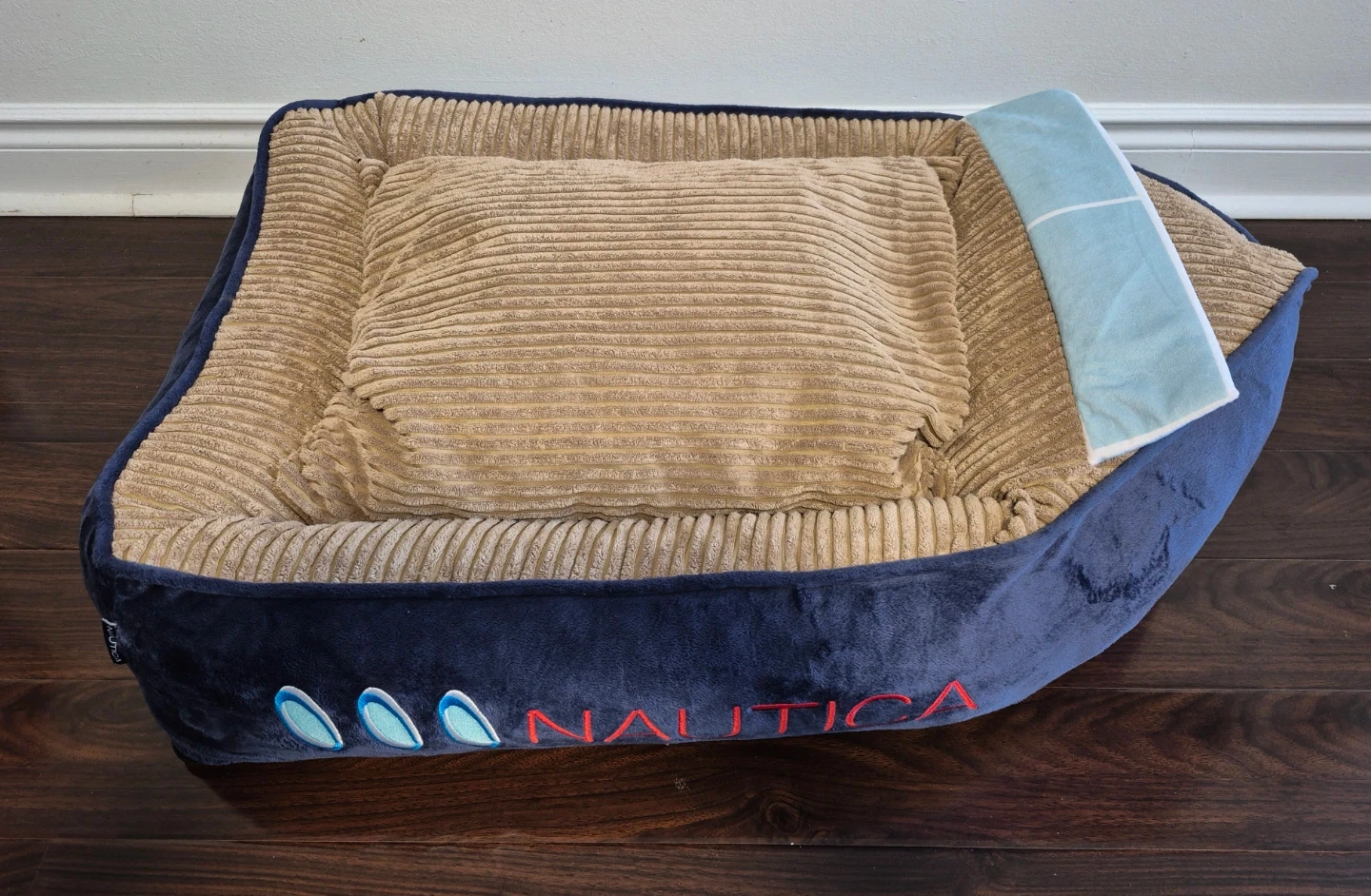 This comfortable Nautica pet bed comes in a navy blue exterior with a tan corduroy cushion.