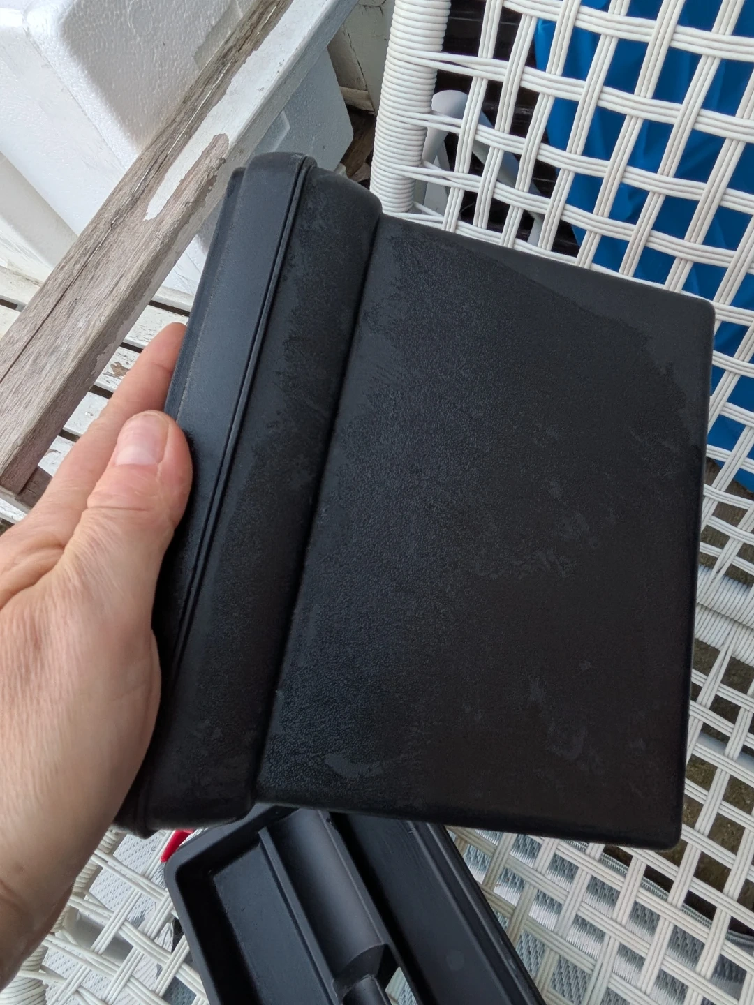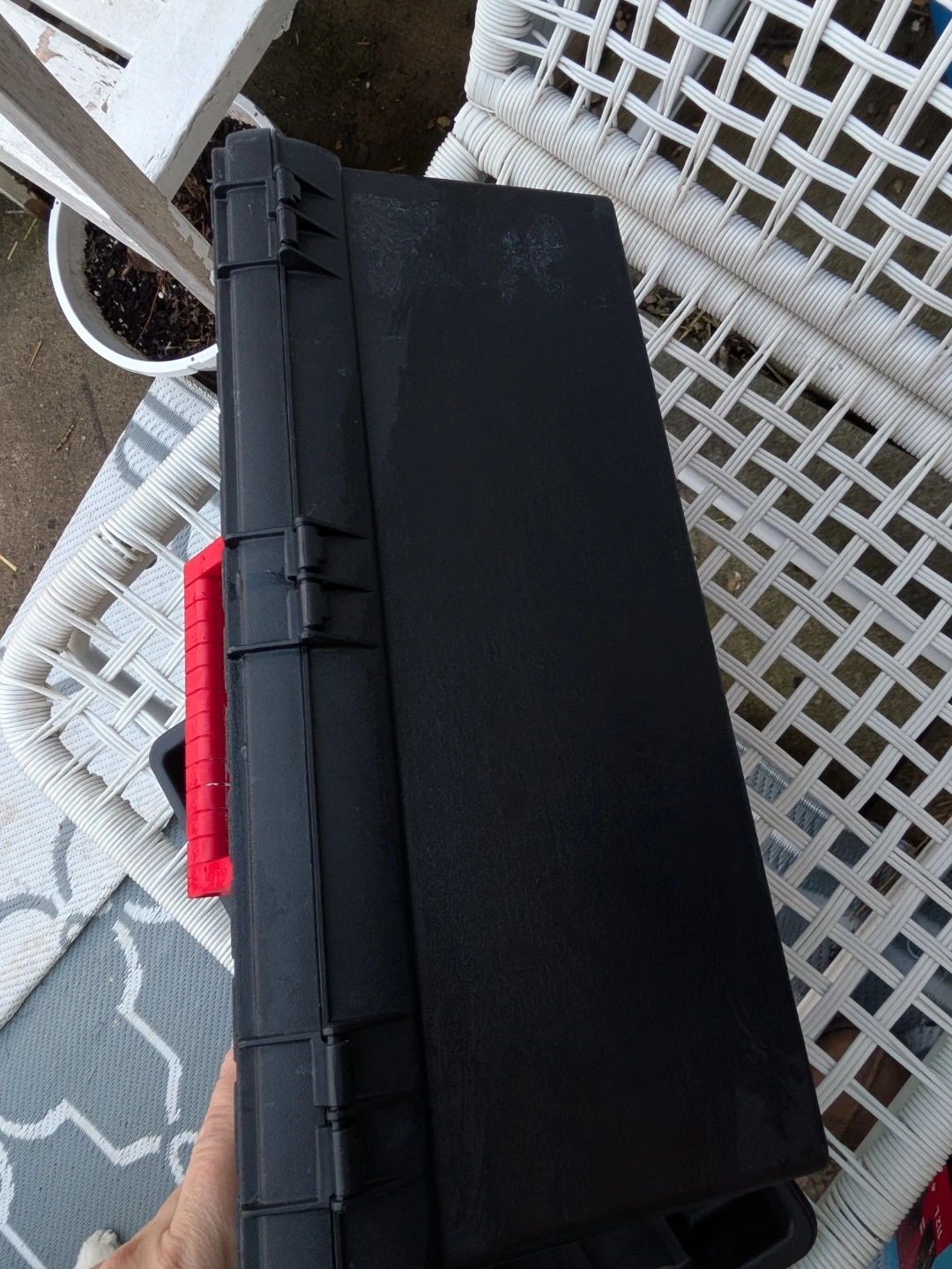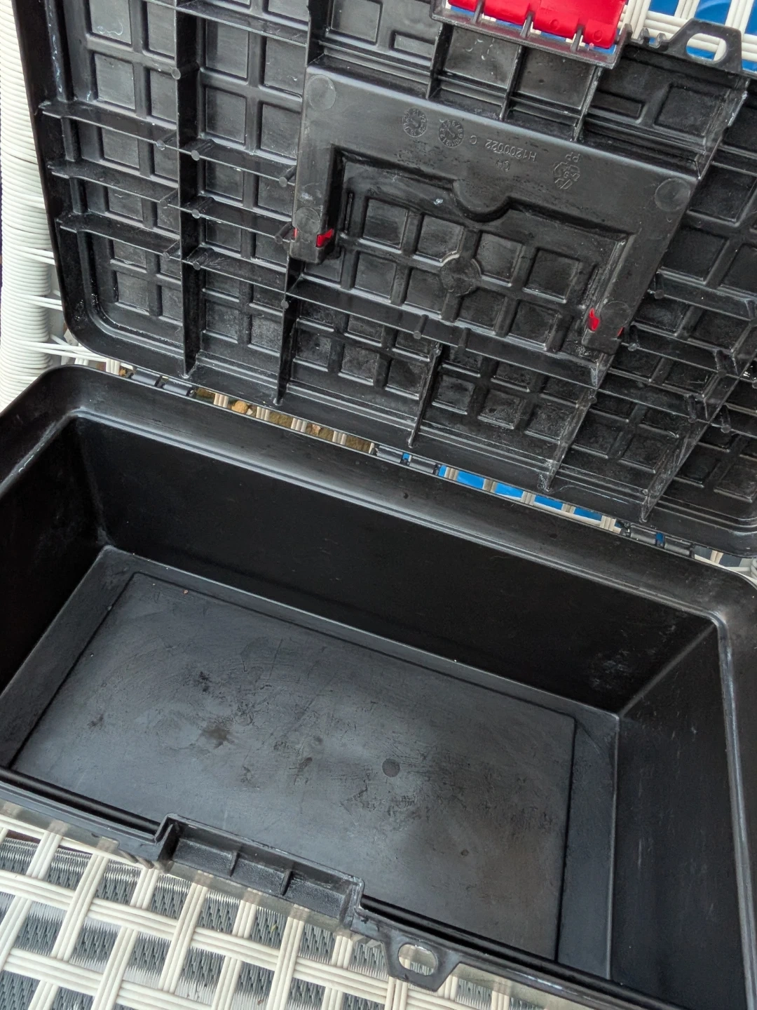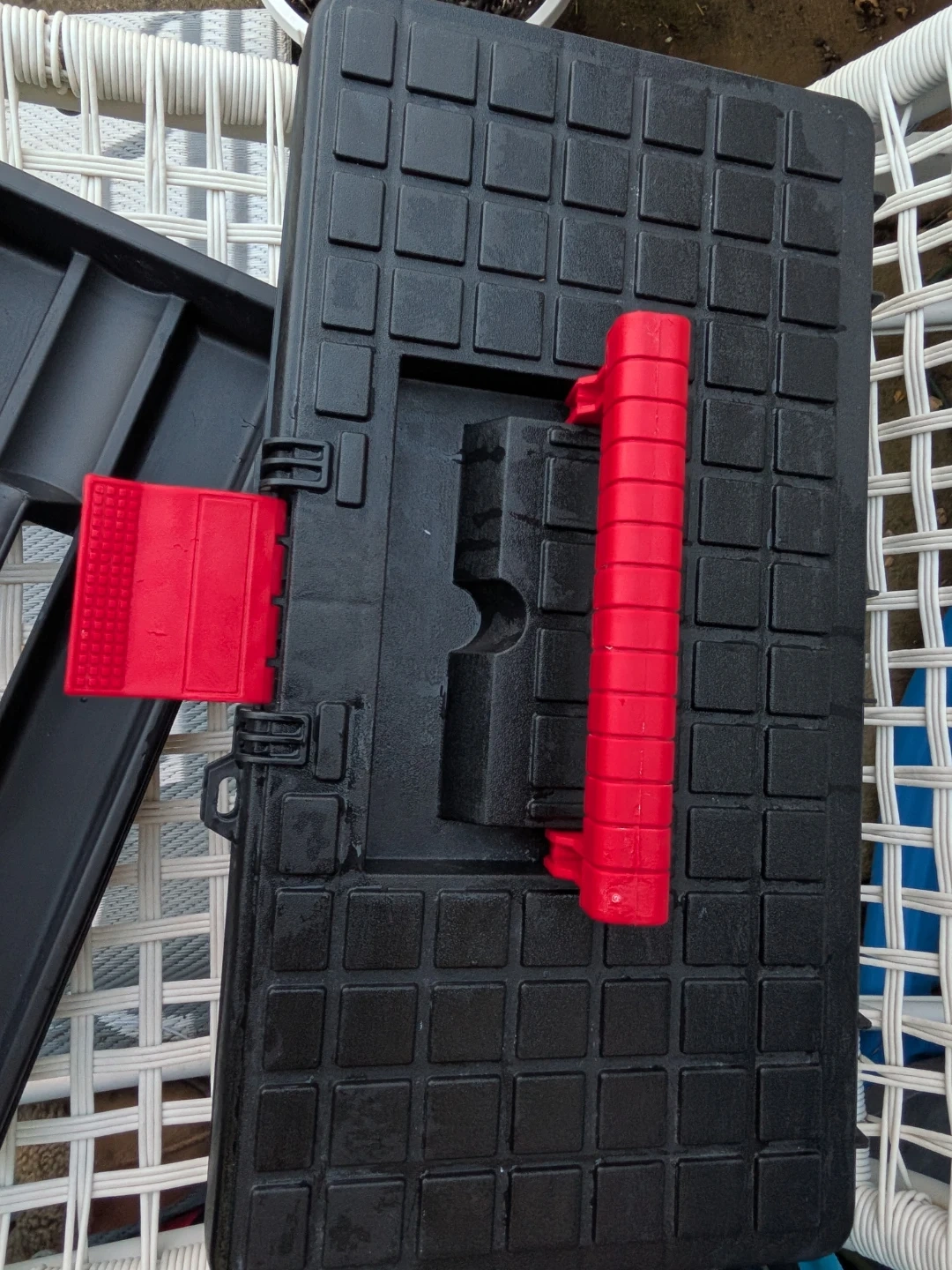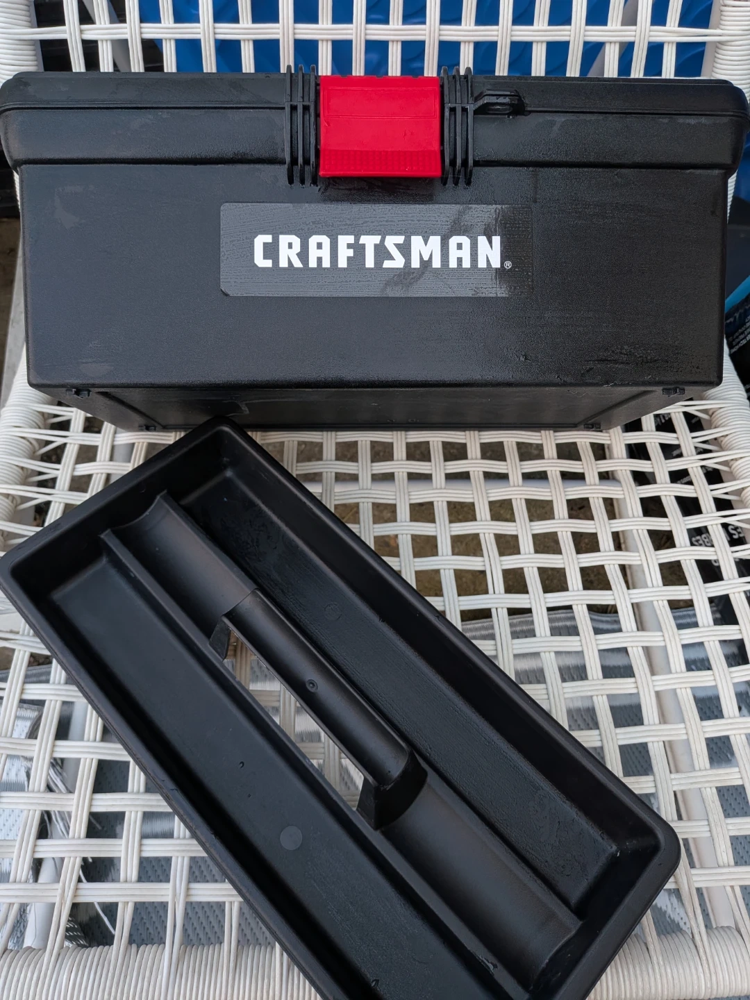This is a black Craftsman tool box with a red latch. It includes a removable black tray for organization. A sturdy option for storing your tools!