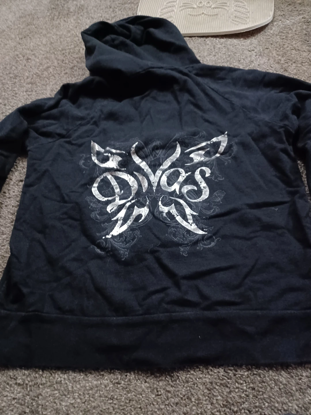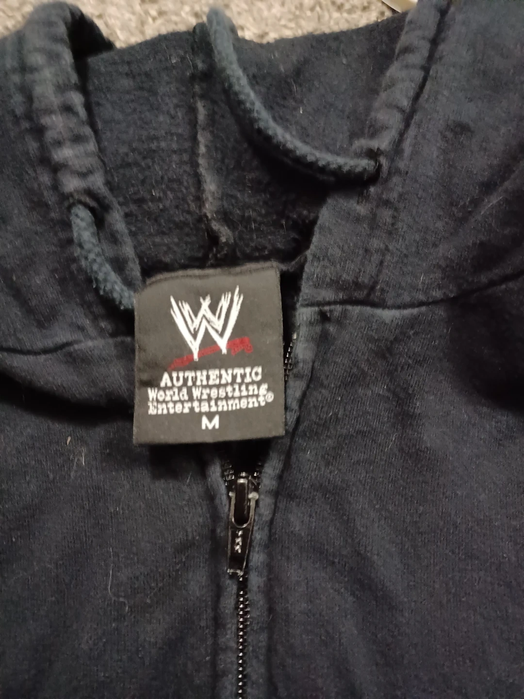 Black zip-up hoodie from Authentic World Wrestling Entertainment. Features a graphic on the back and a full front zipper. Size medium.