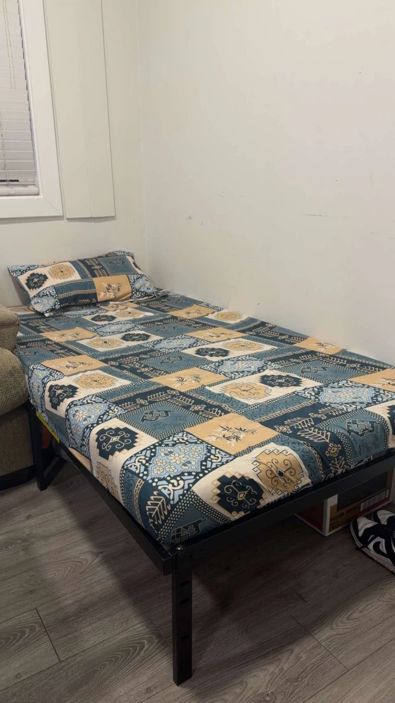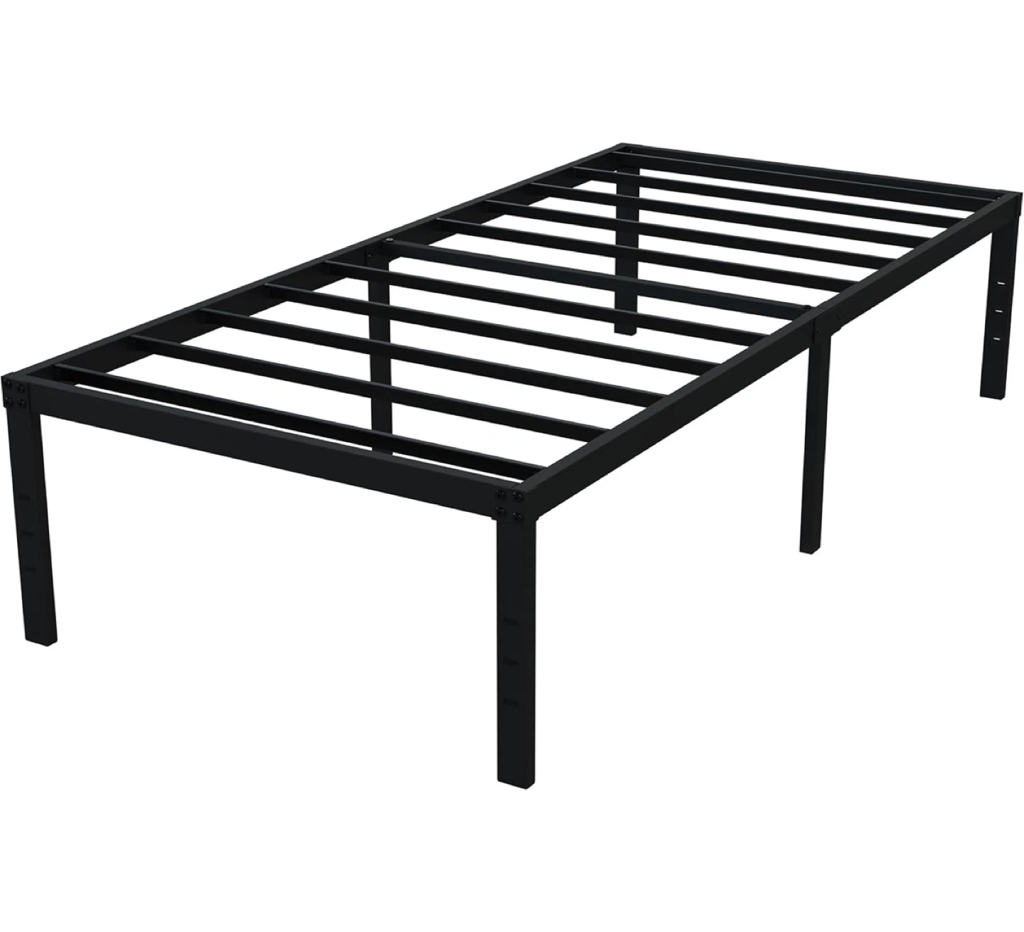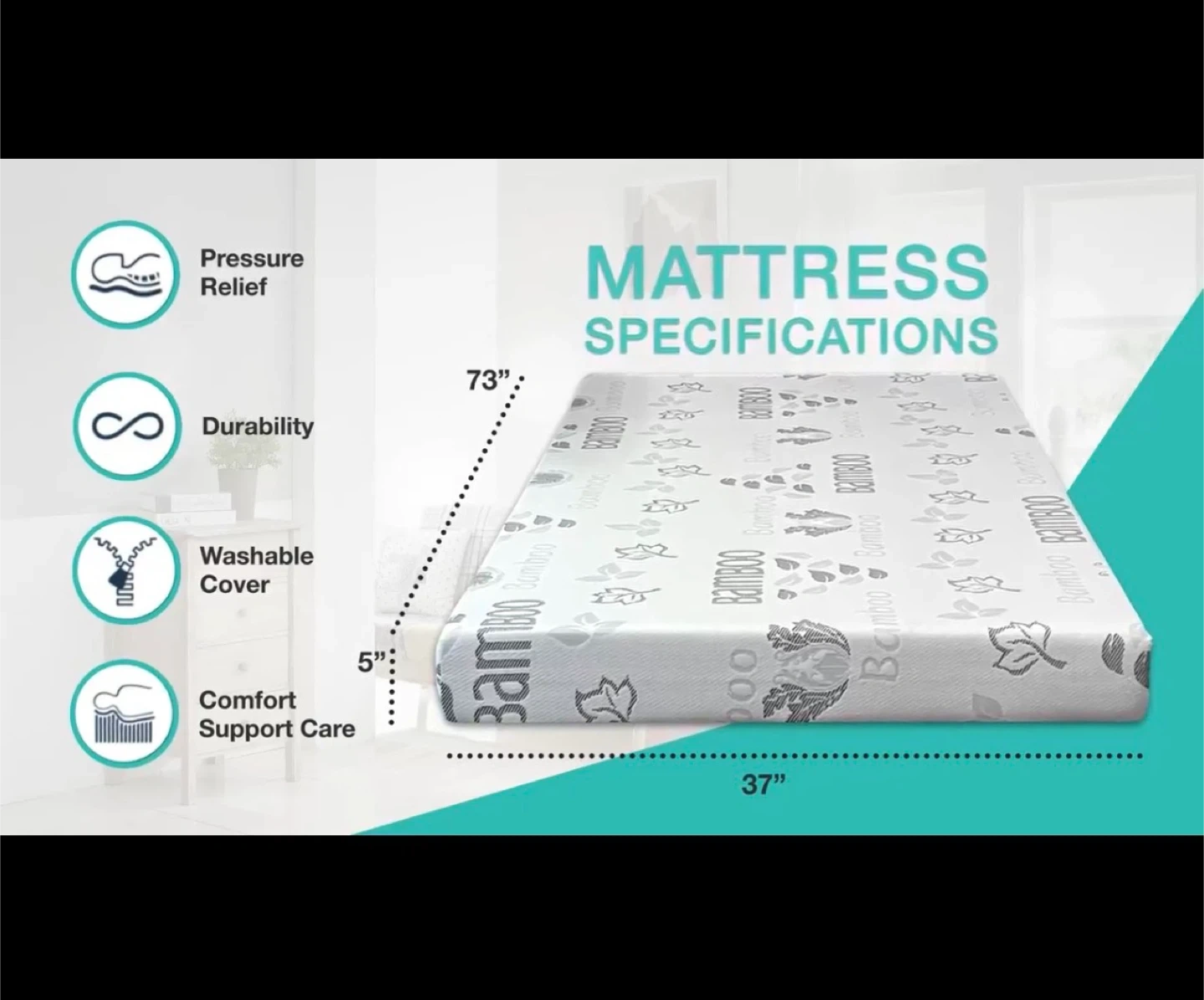 Metal bed frame for a twin mattress. Includes a 5-inch thick mattress with a washable cover. Mattress dimensions are 73" x 37".