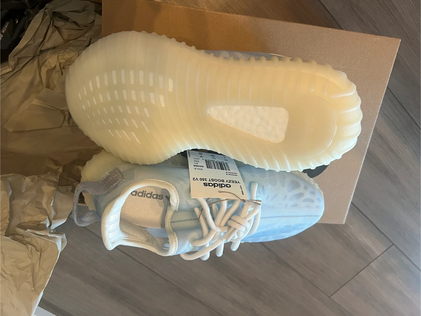 Adidas Yeezy Boost 350 V2 "Mono Ice" sneakers in a light blue colourway. Includes original box.