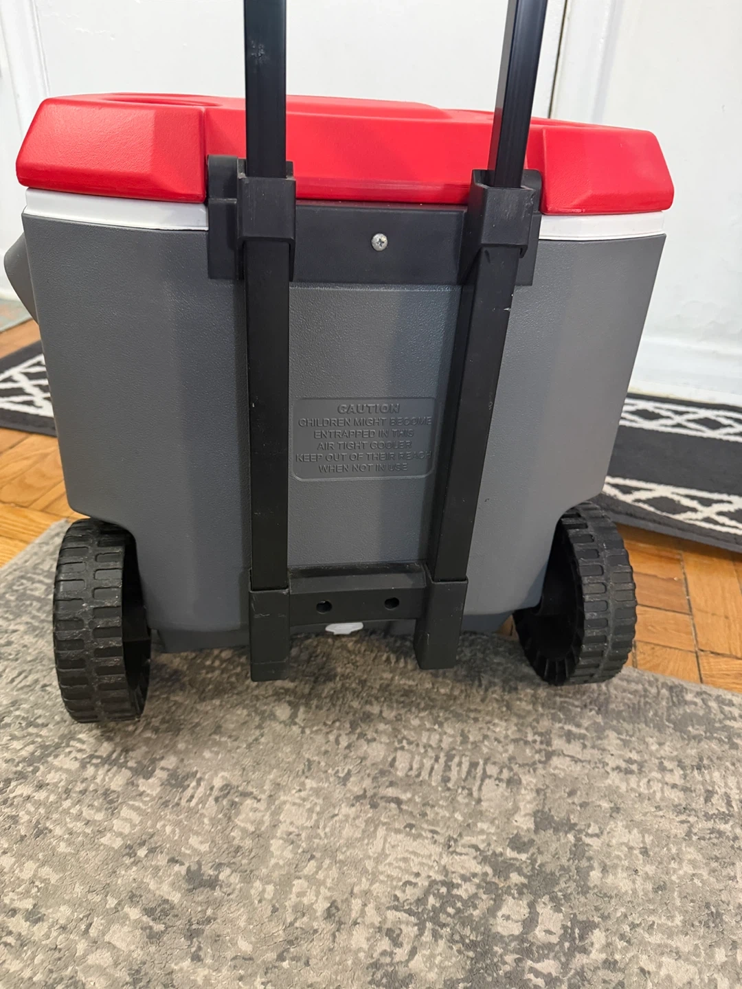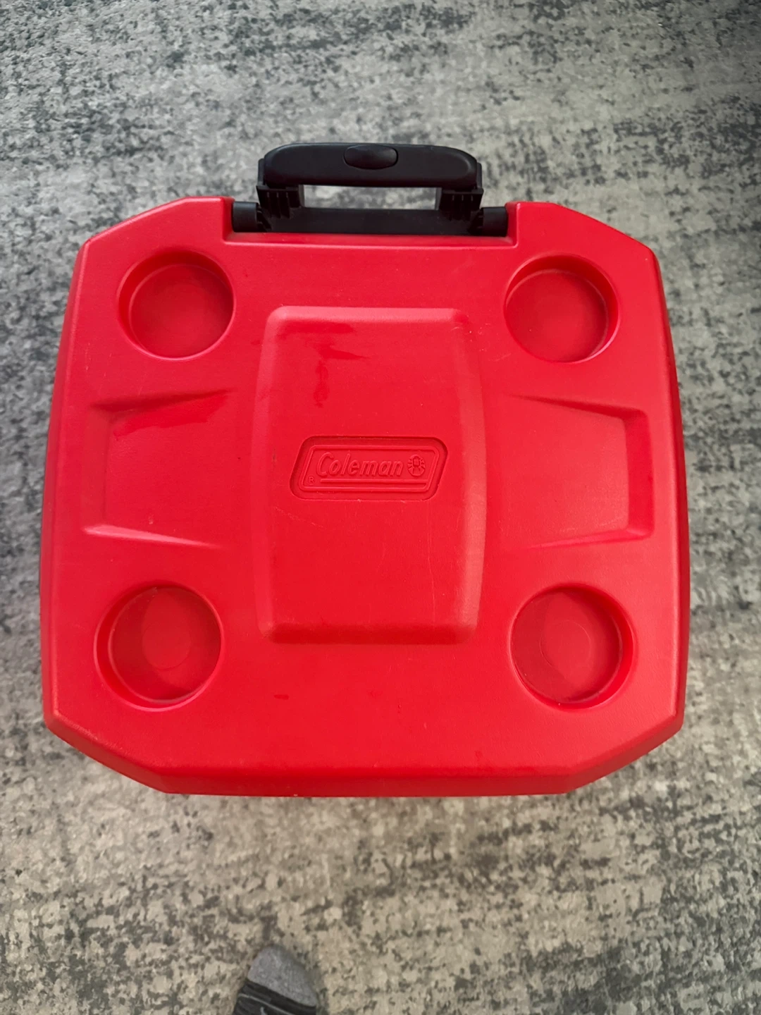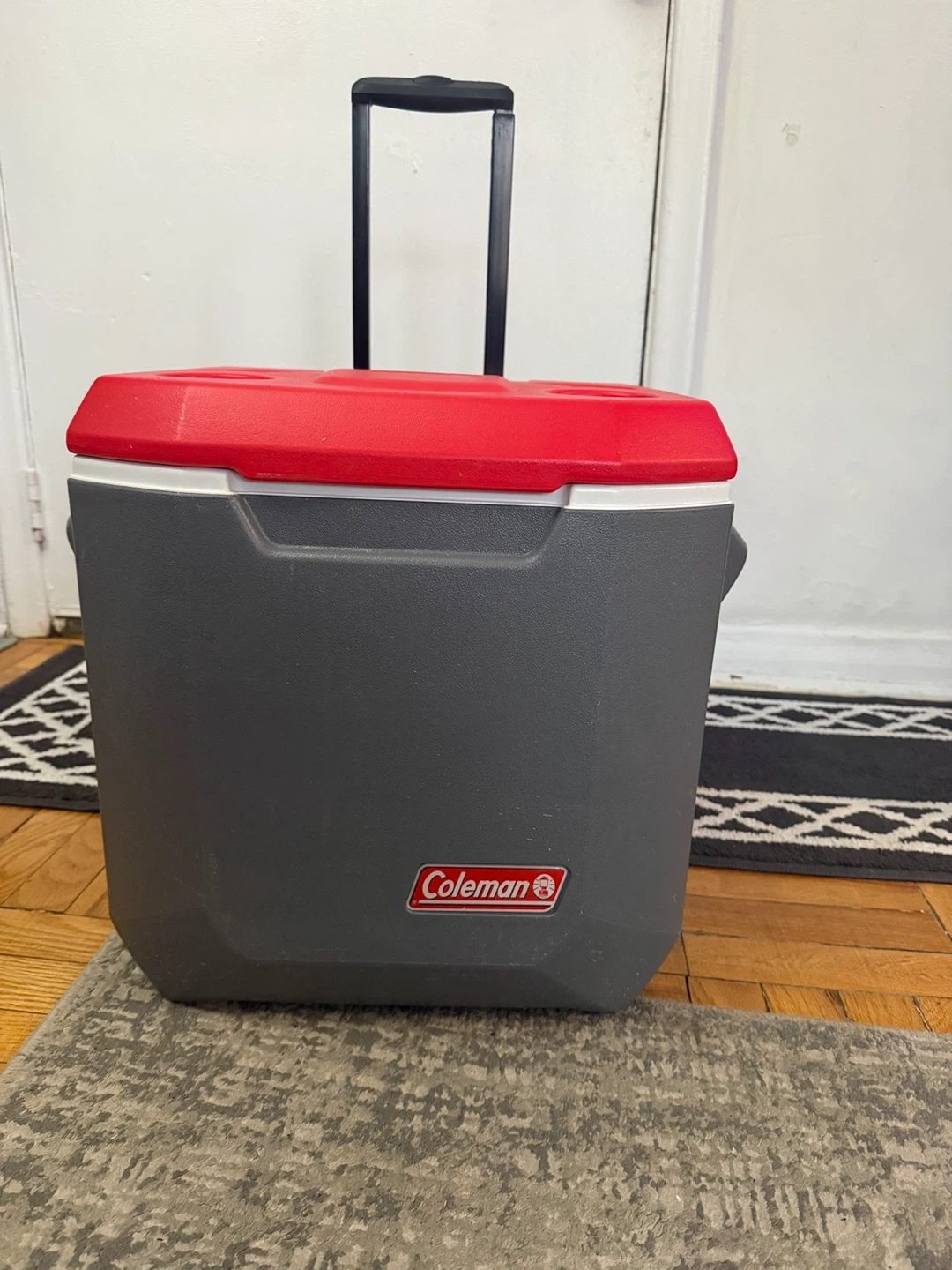 Selling a Coleman rolling cooler! It's grey and red, perfect for keeping your drinks and snacks cold on the go. Great for picnics, camping, or just keeping in the car for road trips