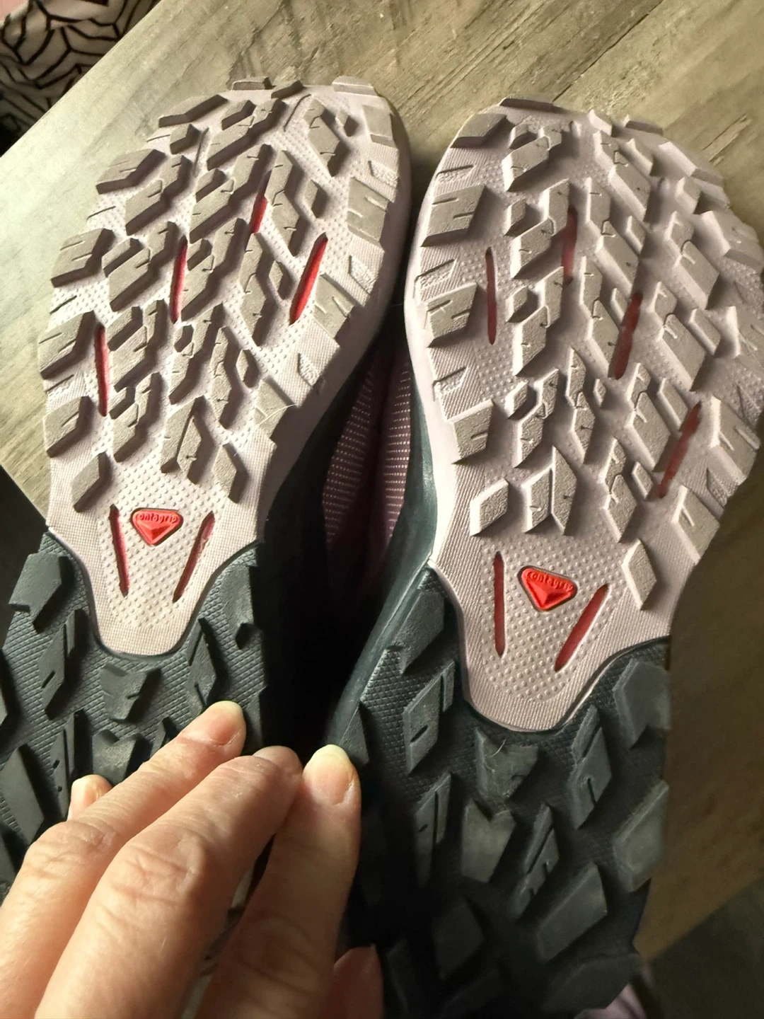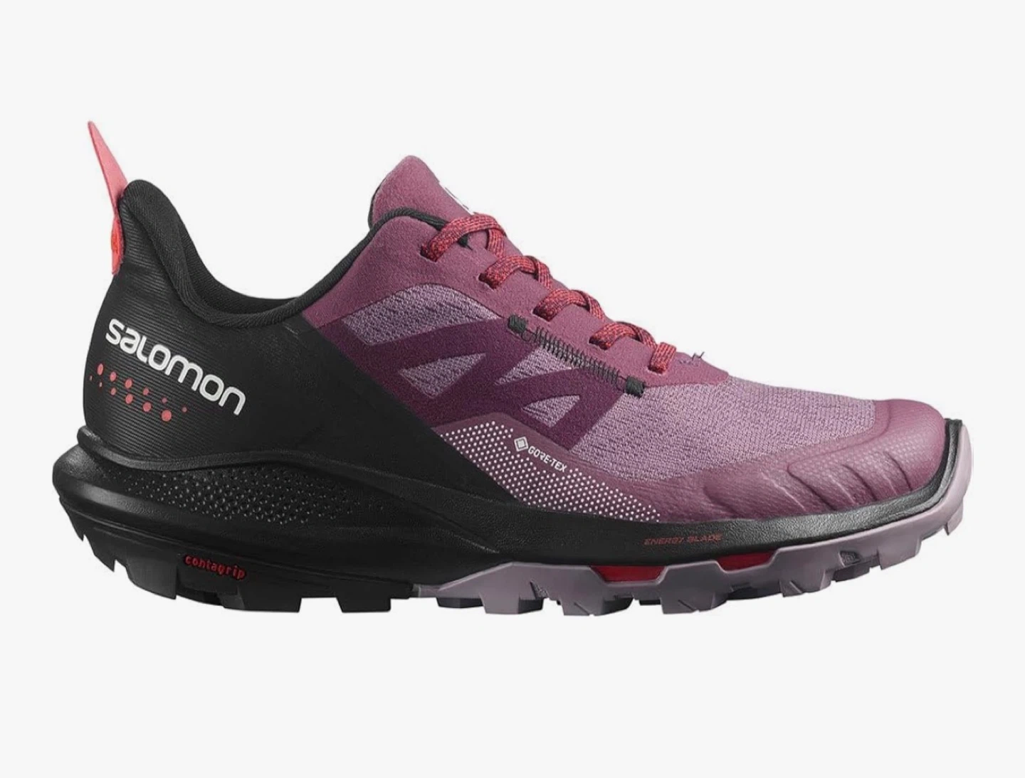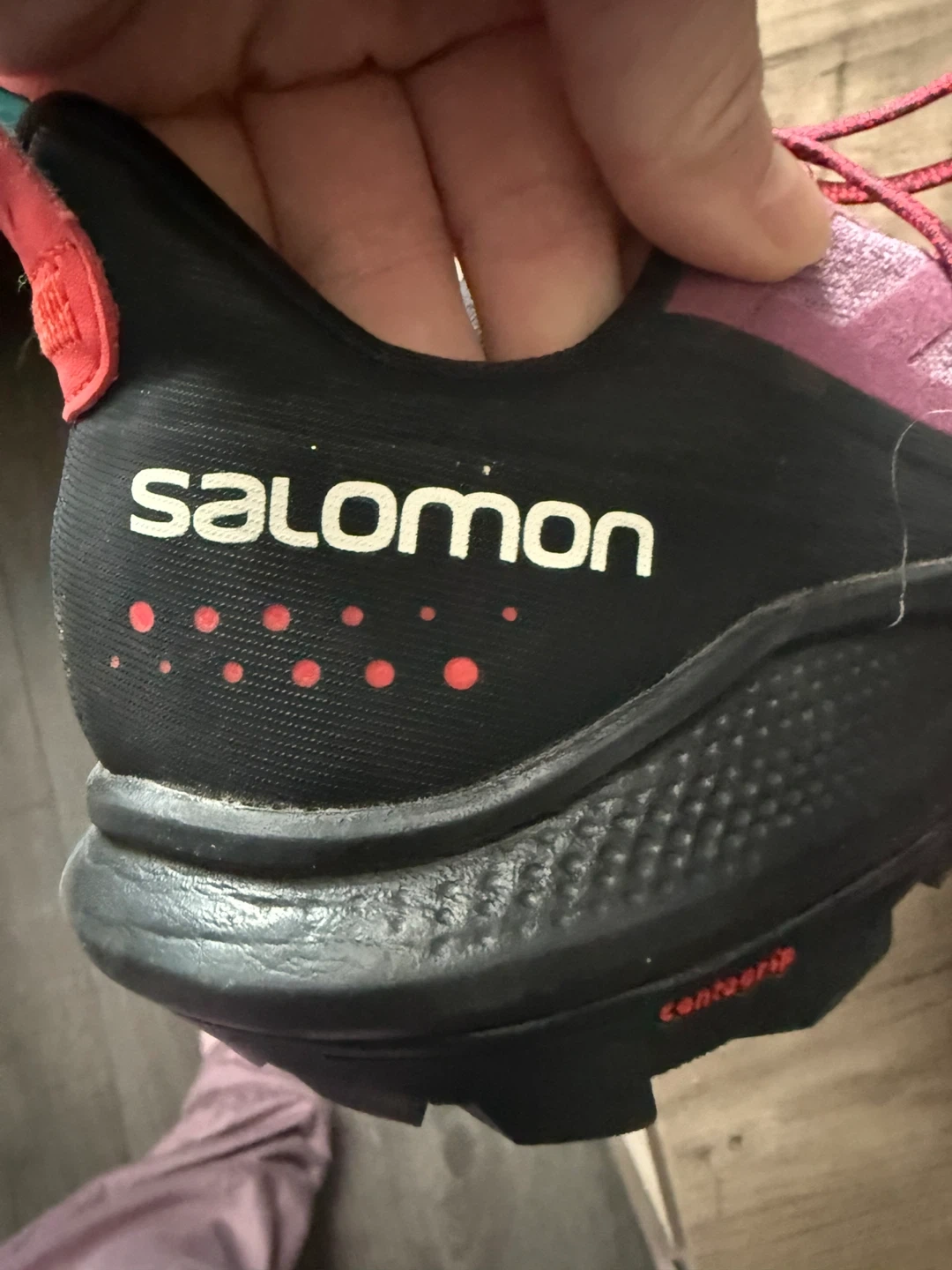 These Salomon trail running shoes feature Gore-Tex for waterproofing. They have a Contagrip sole for traction. The size is a women's 7.5 (EUR 39 1/3, USA 7.5, CN 24.5).