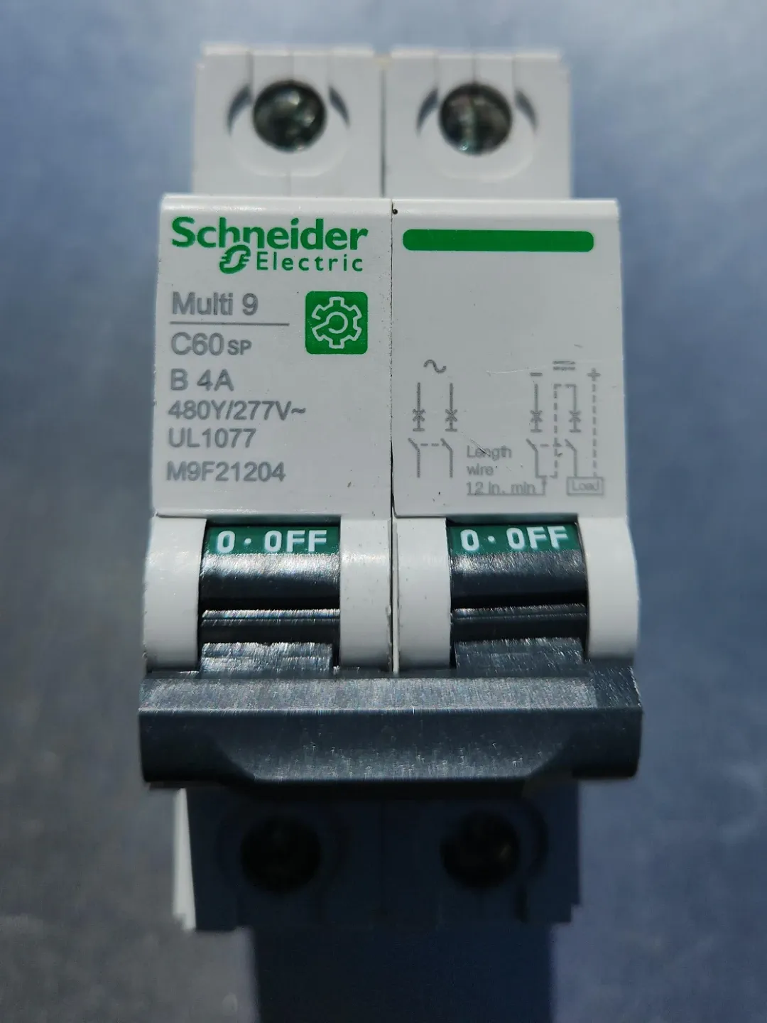Schneider Electric Multi 9 C60SP circuit breaker. Rated at 4 Amp with 480Y/277V capability. It's suitable for use with AWG 18-8 Cu wire.
