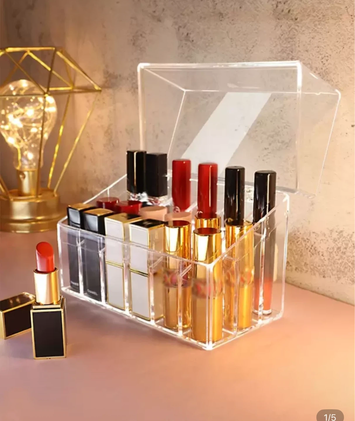Selling a clear acrylic organizer, perfect for storing lipsticks and other cosmetics. It has multiple compartments to keep everything tidy and easy to find. It's in great condition and ready to help organize your makeup collection!