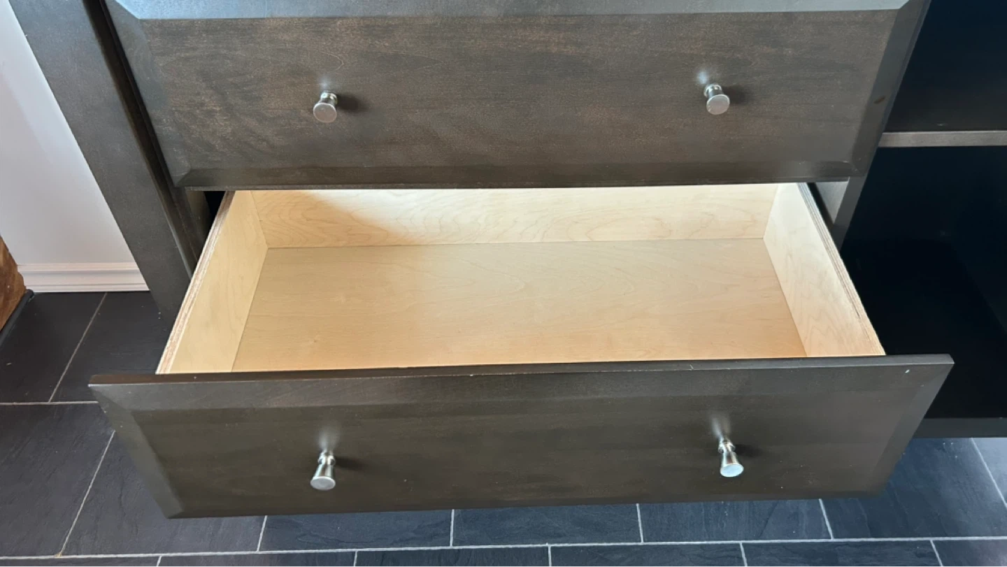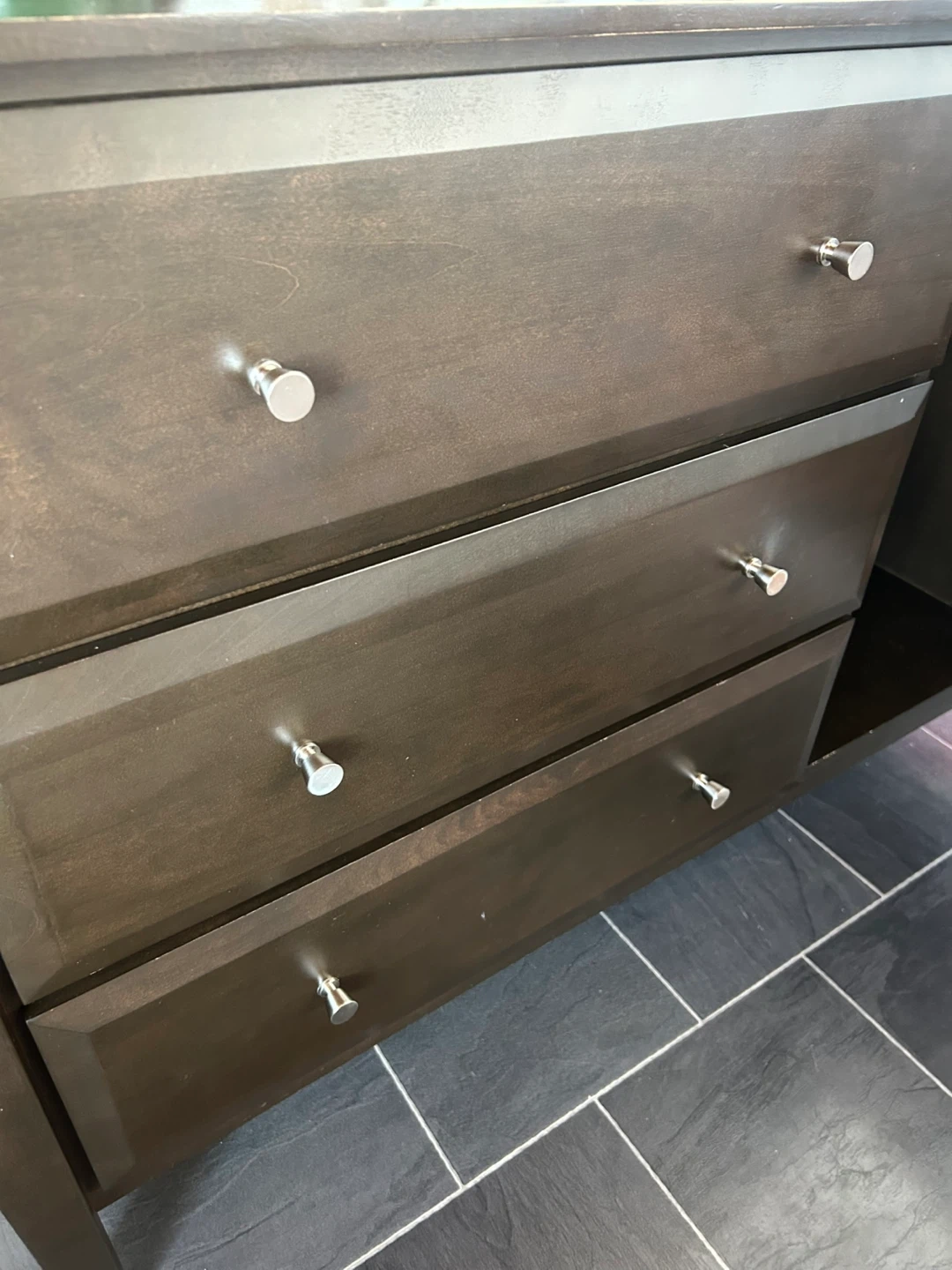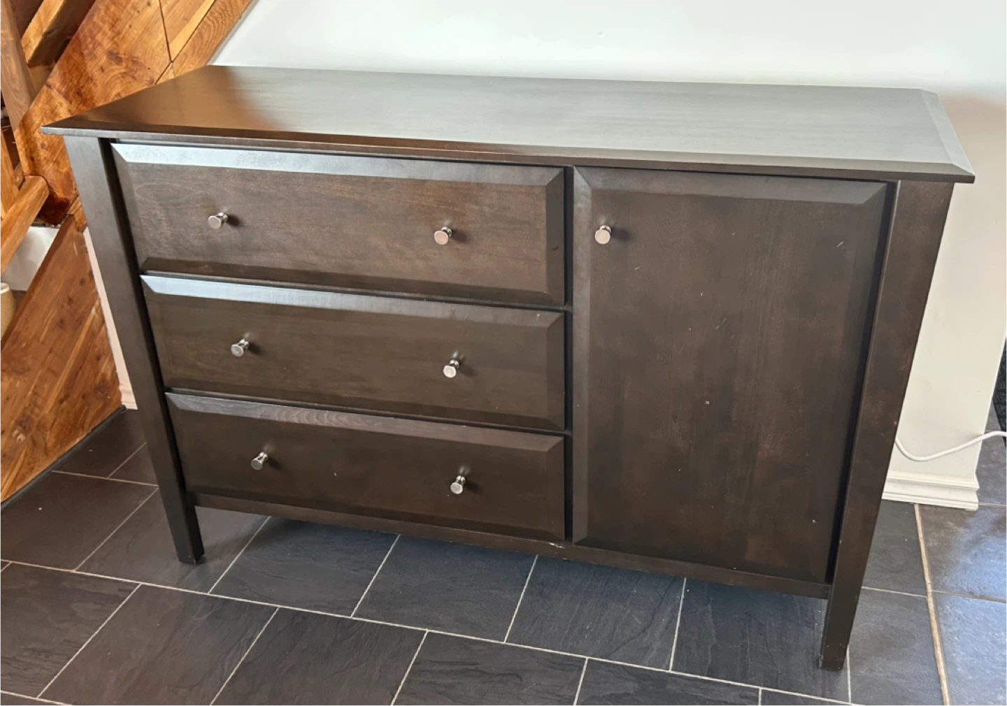 Dark brown dresser featuring three drawers and a cabinet on the side. Its wood construction offers a sturdy storage solution. Plenty of space for clothes or linens! Made in Canada
