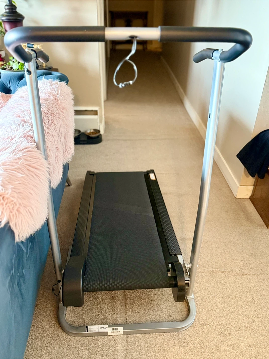 A compact treadmill suitable for walking or light jogging. It's made with a durable metal frame and a textured running belt. This treadmill is a great option for home workouts when space is limited!