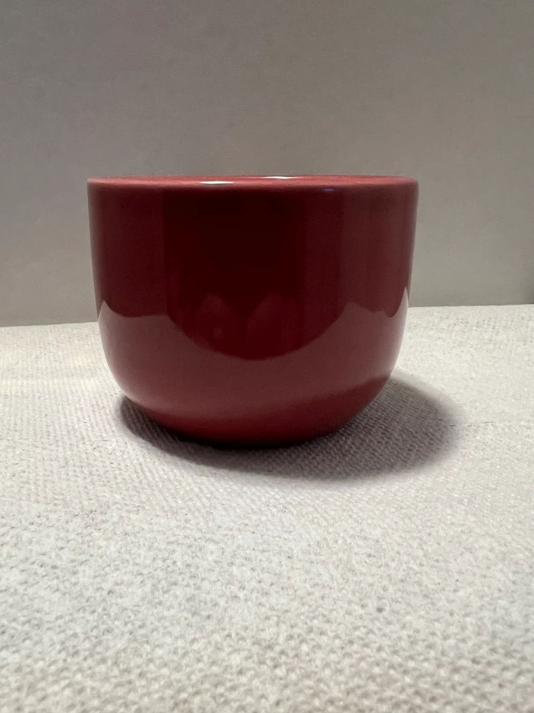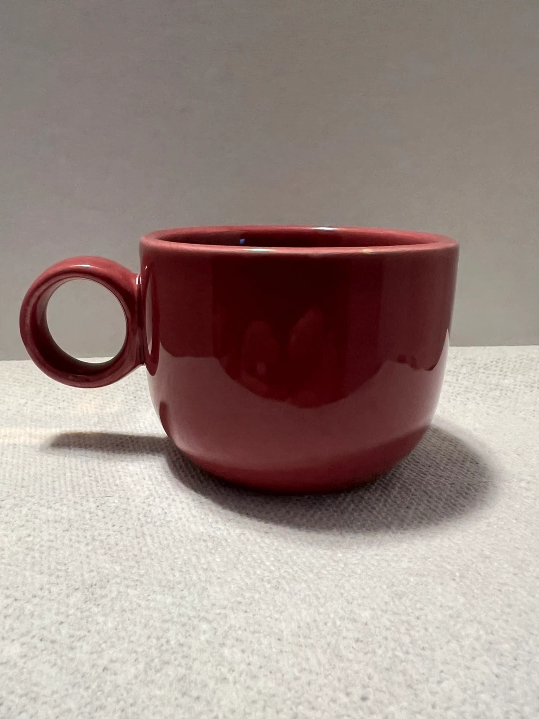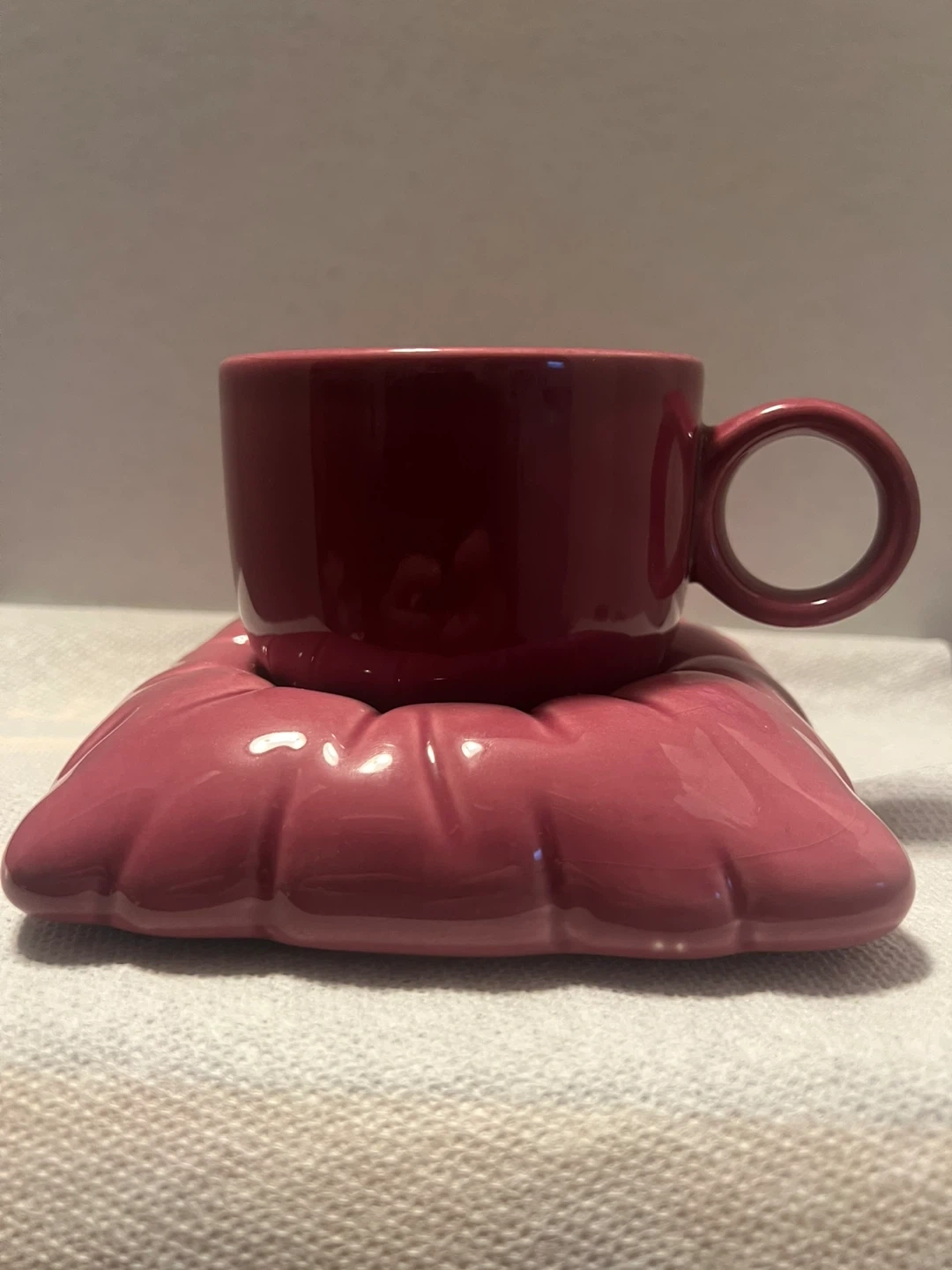 This is a ceramic drinkware set featuring a magenta mug and a matching square saucer designed to look like a tufted pillow. The cup has a capacity of approximately 10.4 ounces. Both pieces have a glossy glaze finish.