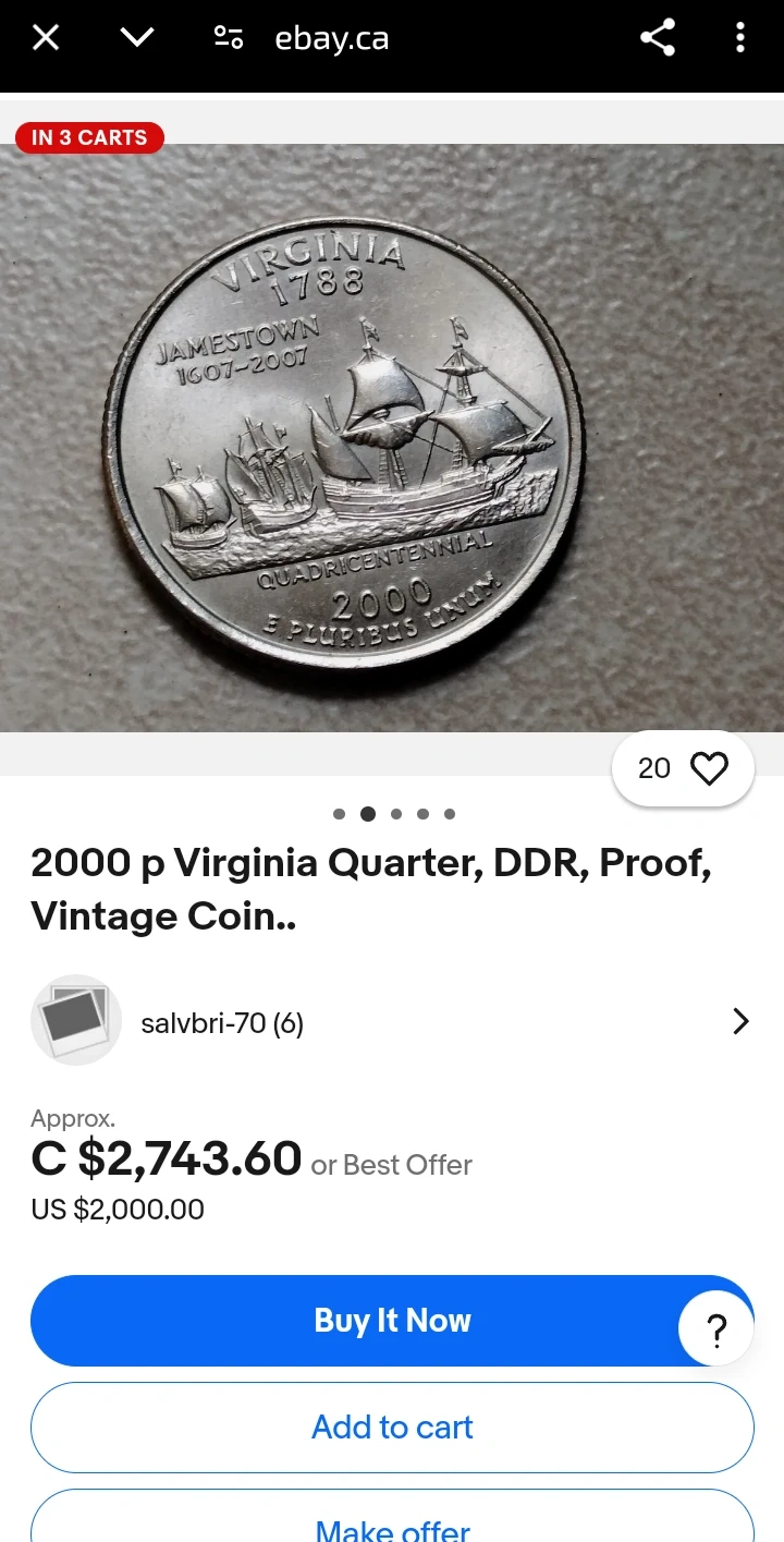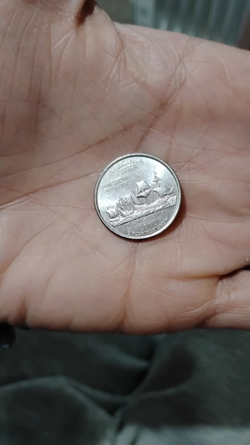 This is a 2000 Virginia Quarter, commemorating the Jamestown Quadricentennial (1607-2007). It features a ship design on the reverse. This coin could be a great addition for collectors interested in U.S. state quarters or historical commemorations.
