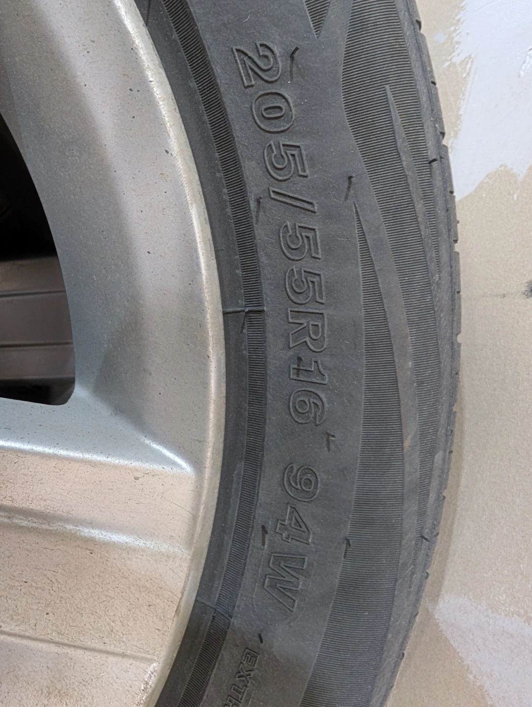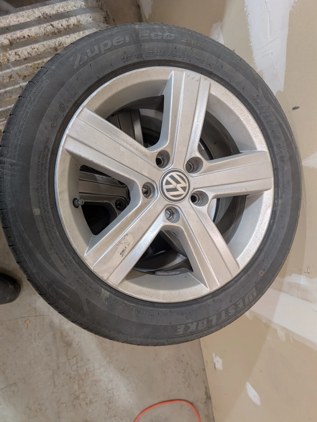 Set of four Volkswagen alloy wheels with Westlake Super Eco tires. Tire size is 205/55R16 94W. These wheels are a direct fit for many VW models. 85-90% tread left, all seasons.