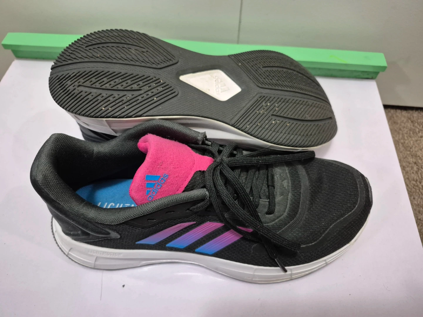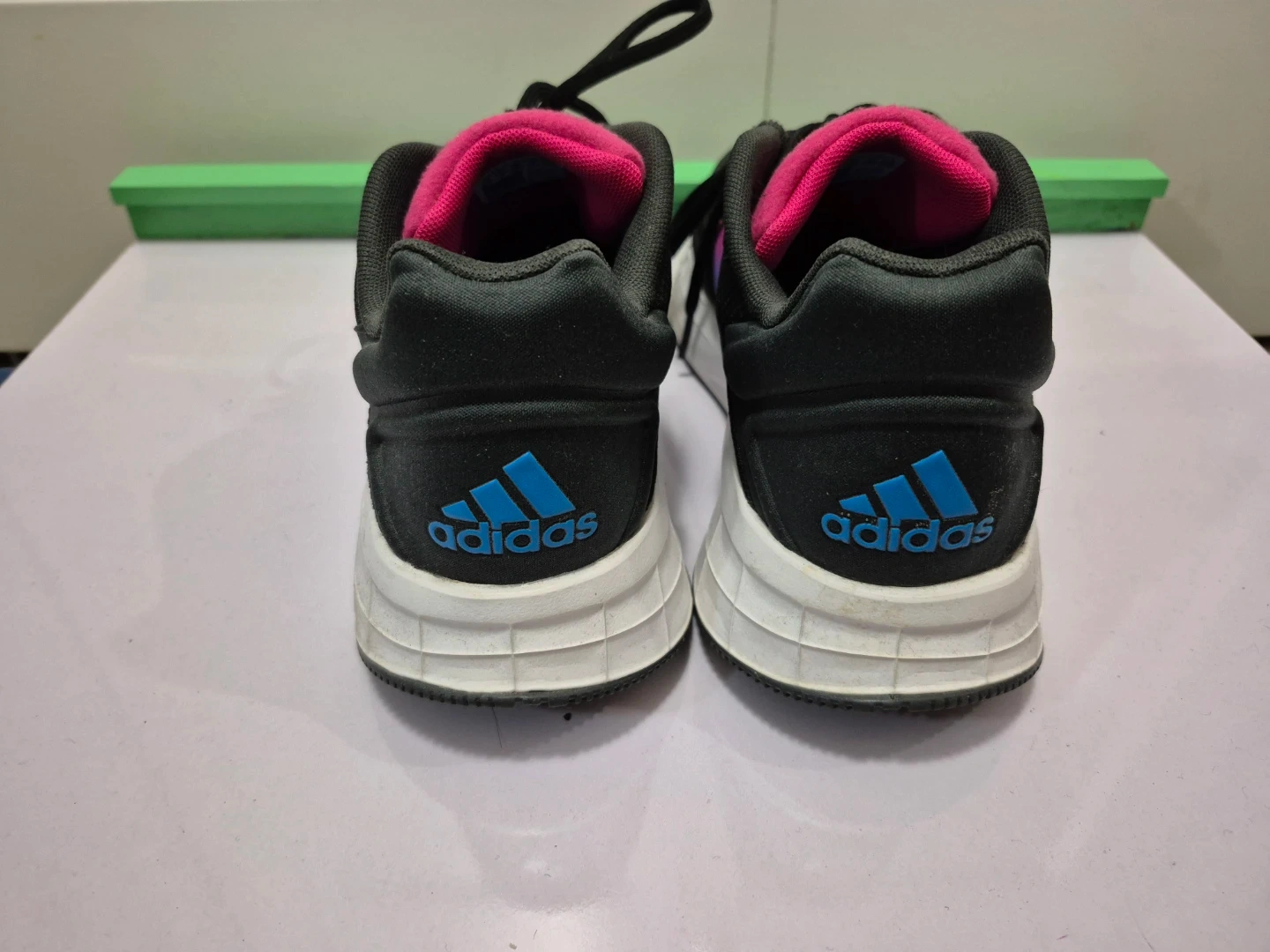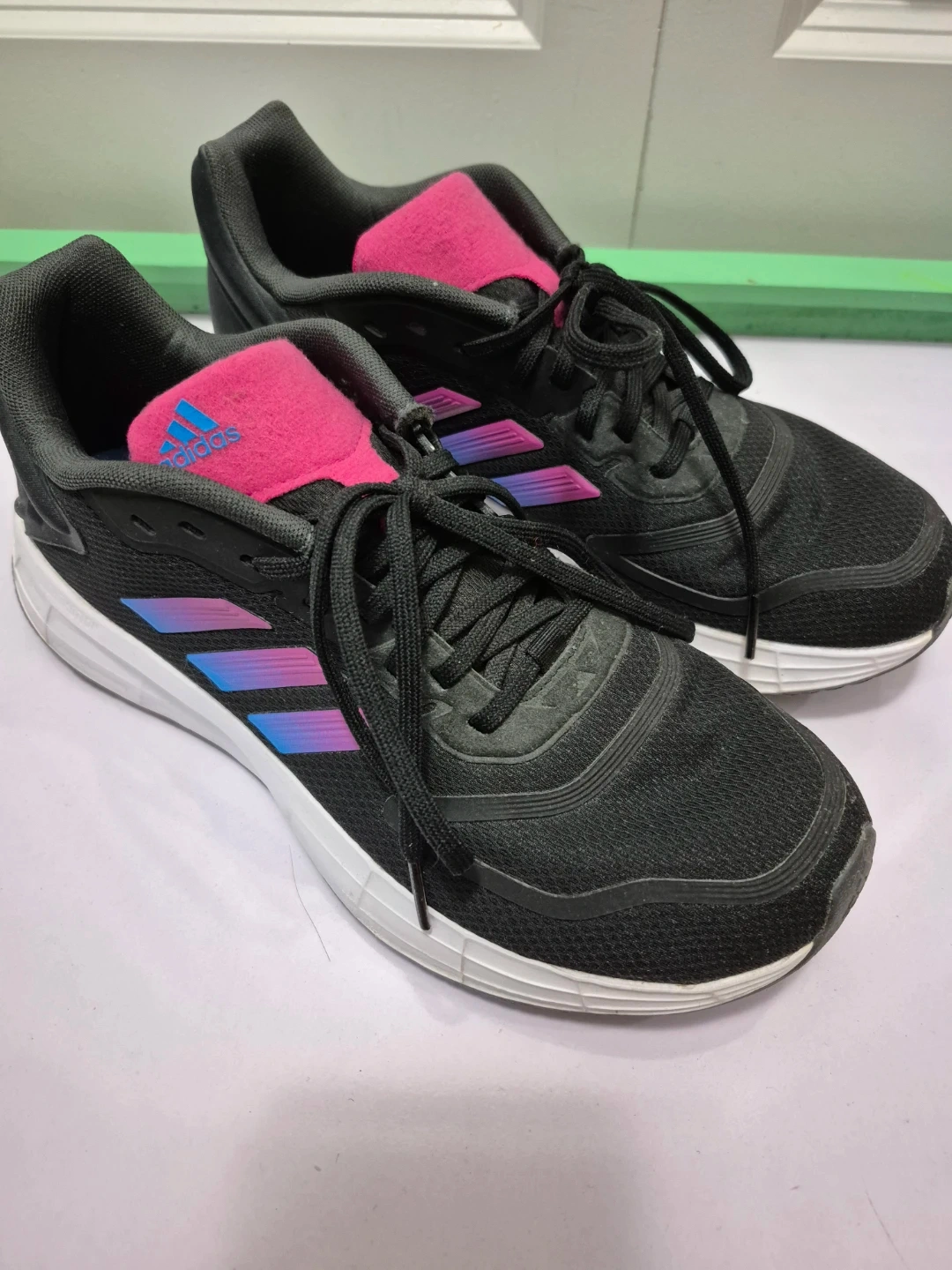 These are black Adidas running shoes with pink and blue accents. They feature a lace-up closure and a durable sole. They're great for workouts or casual wear! Size US 8.5 WOMEN. For pick up only