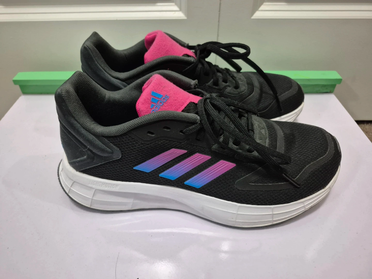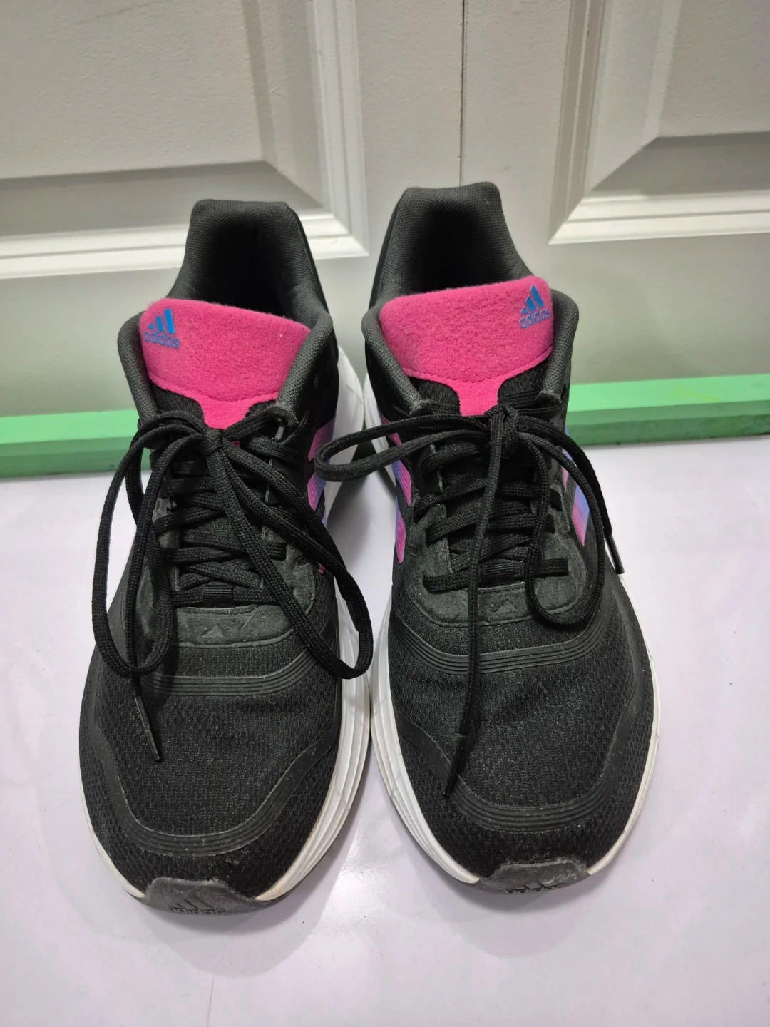 These are black Adidas running shoes with pink and blue accents. They feature a lace-up closure and a durable sole. They're great for workouts or casual wear! Size US 8.5 WOMEN. For pick up only