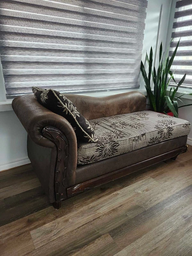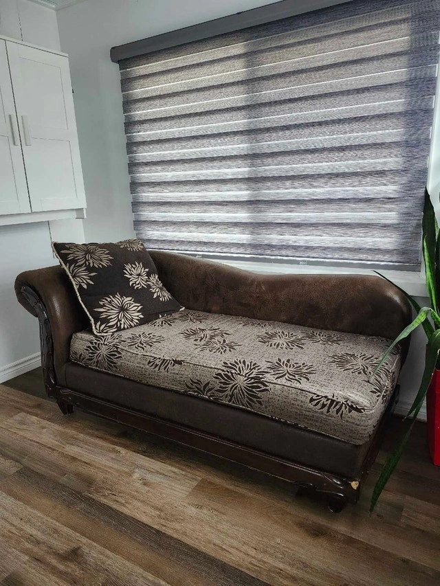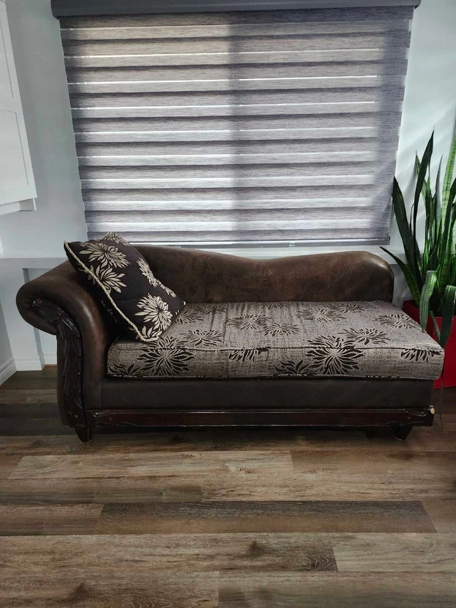 Relax in style with this unique chaise lounge! It's a used piece that brings a touch of elegance to any room. Its decorative accents add a distinctive flair, making it more than just a seat, but a statement piece. Due to its used condition, there are some signs of wear, but it remains comfortable and sturdy. This lounge is perfect for cozying up with a good book or adding a sophisticated touch to your living space. If the ad is up, it's still available! Cash accepted.
