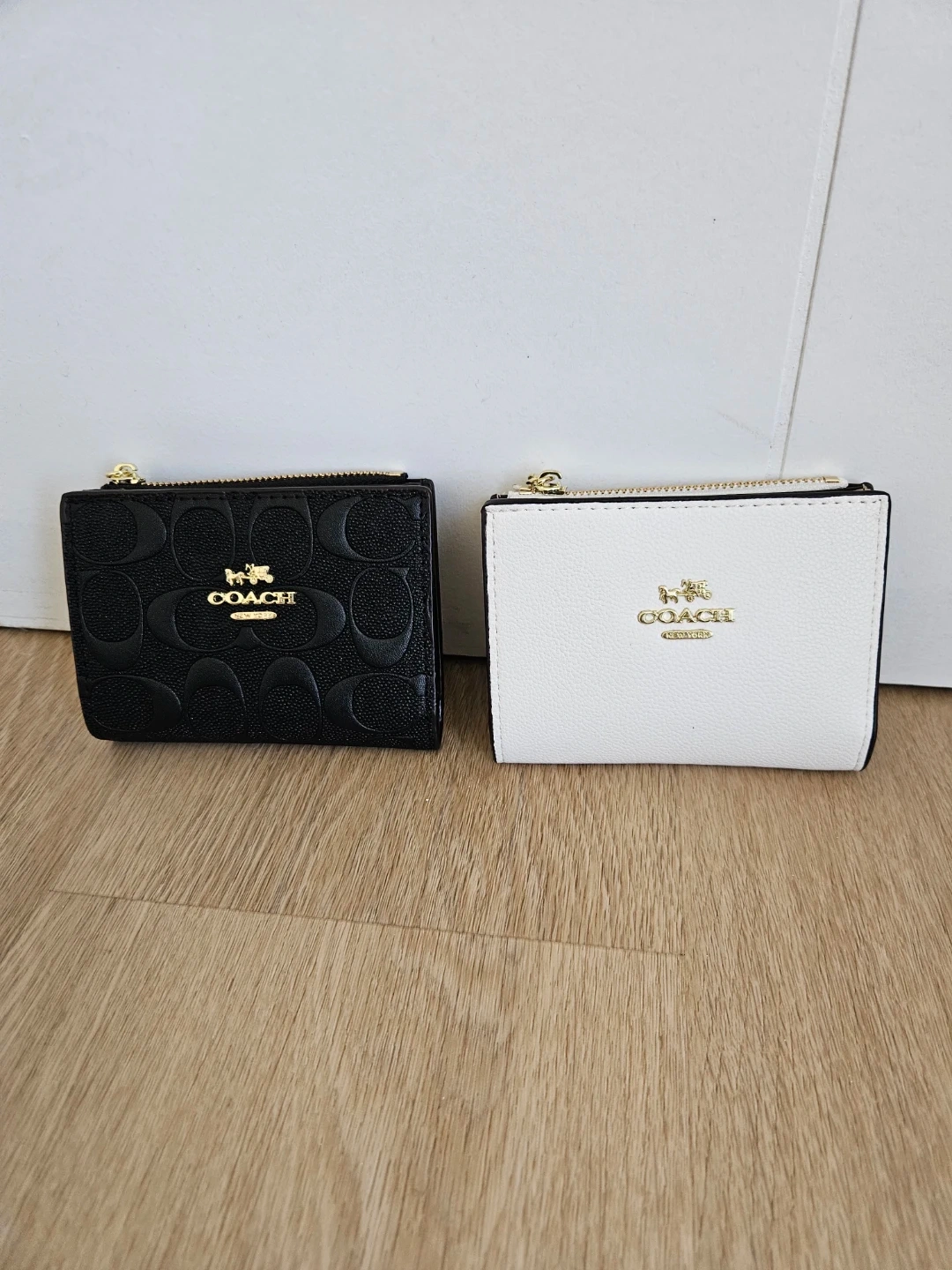 This is a Coach medium zip-around wallet in black with the signature "C" pattern. It's a compact and stylish accessory for your essentials. Made with durable materials for everyday use.