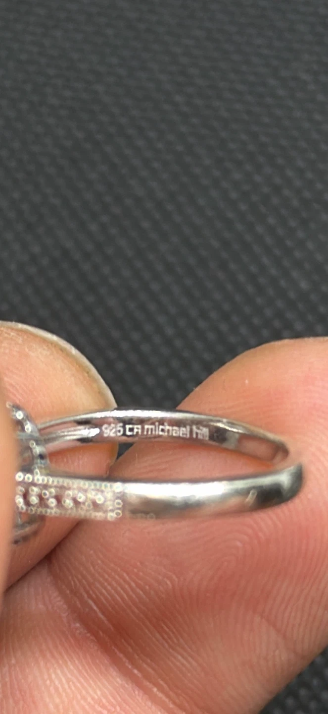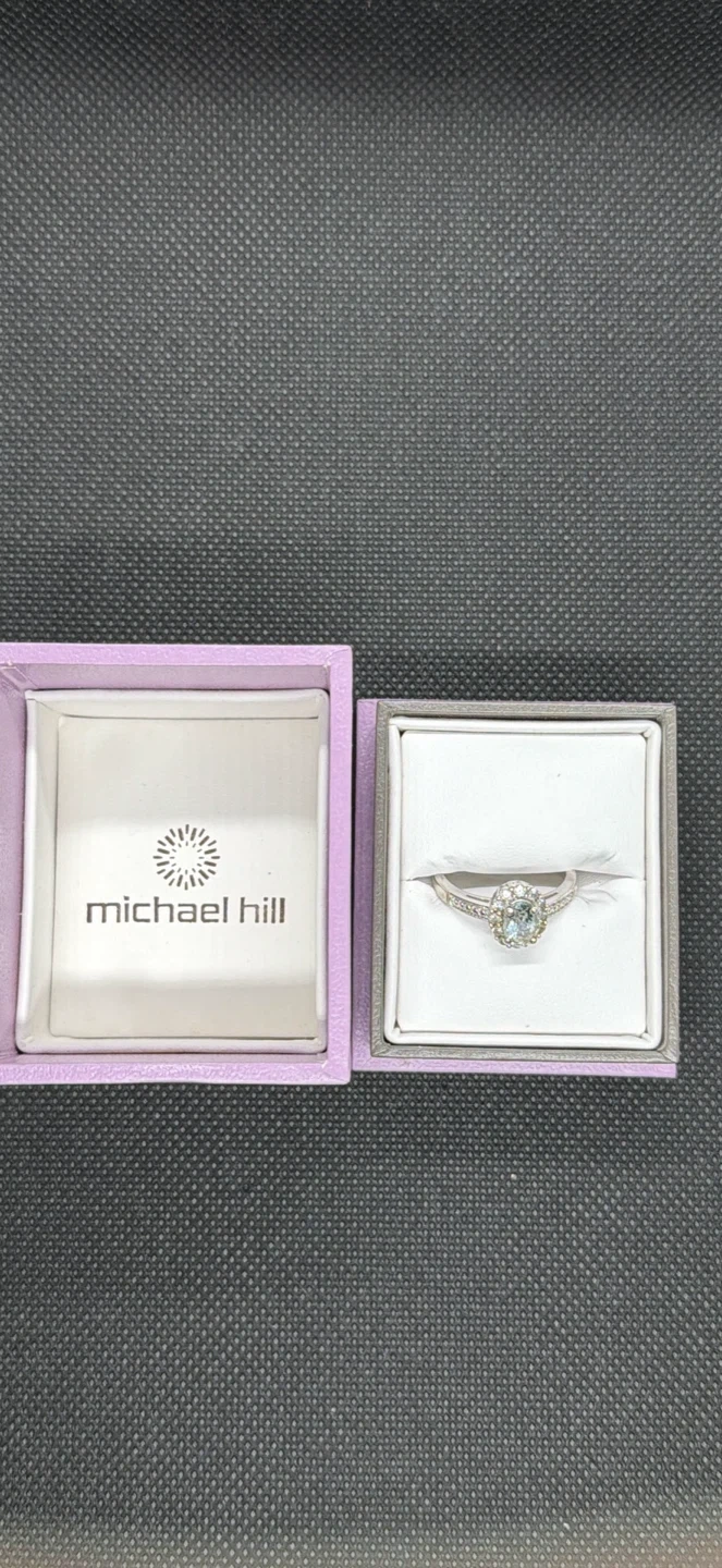 This ring features a stunning aquamarine gemstone surrounded by smaller accent stones. It's crafted from 925 sterling silver, marked by the Michael Hill brand. It comes with its original box, making it a thoughtful gift or personal treat!