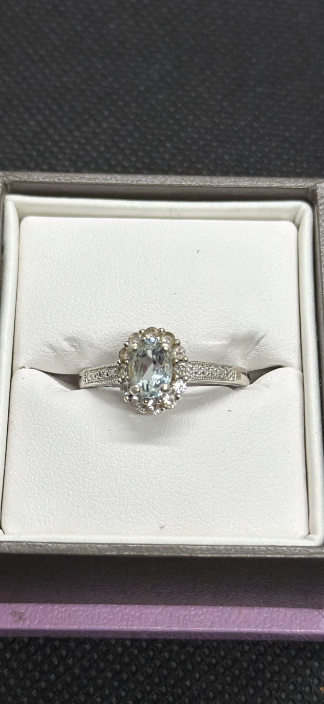 This ring features a stunning aquamarine gemstone surrounded by smaller accent stones. It's crafted from 925 sterling silver, marked by the Michael Hill brand. It comes with its original box, making it a thoughtful gift or personal treat!