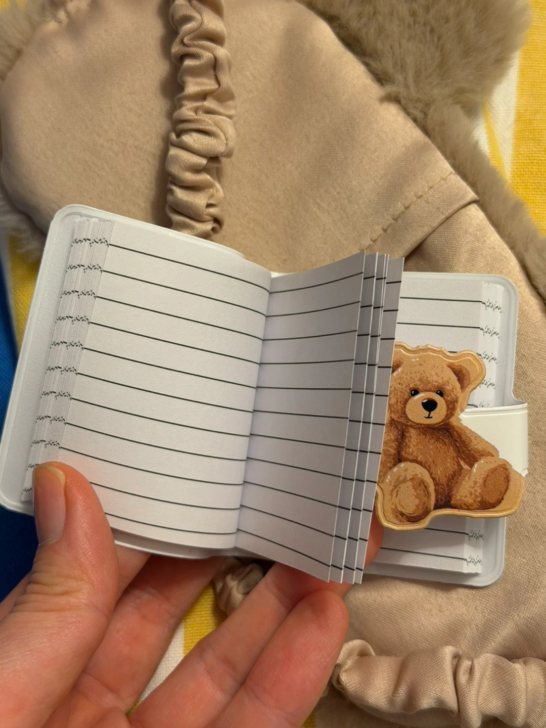 This adorable fuzzy sleep mask features cute bear ears and a soft, plush exterior. It includes a tiny lined notebook.