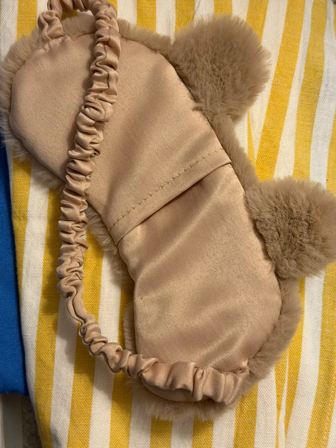 This adorable fuzzy sleep mask features cute bear ears and a soft, plush exterior. It includes a tiny lined notebook.
