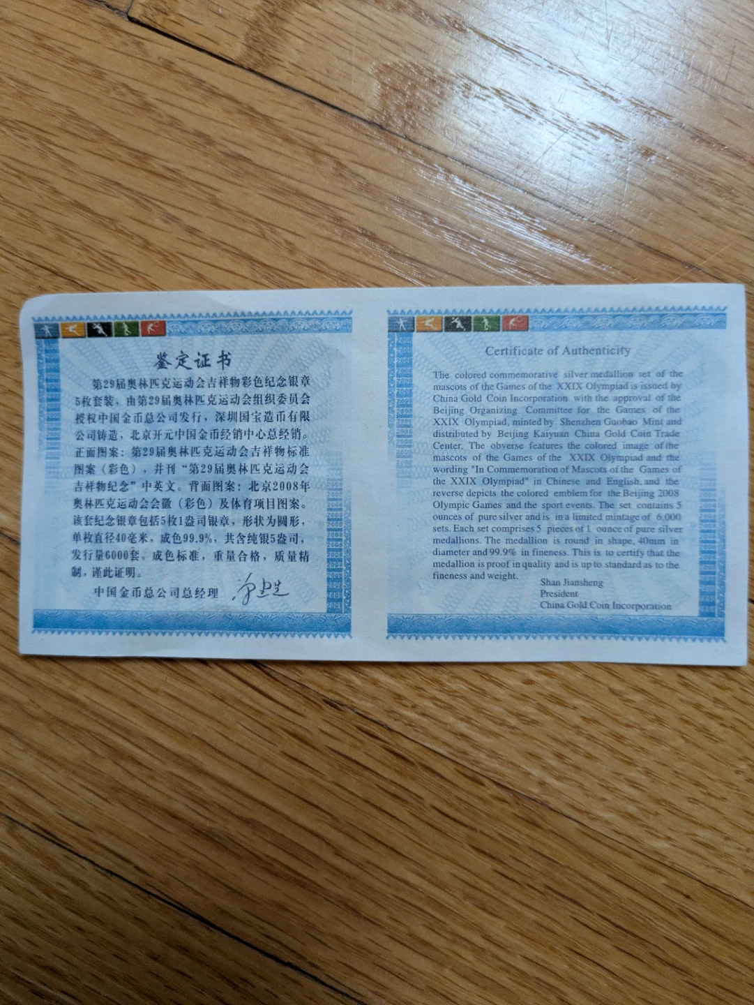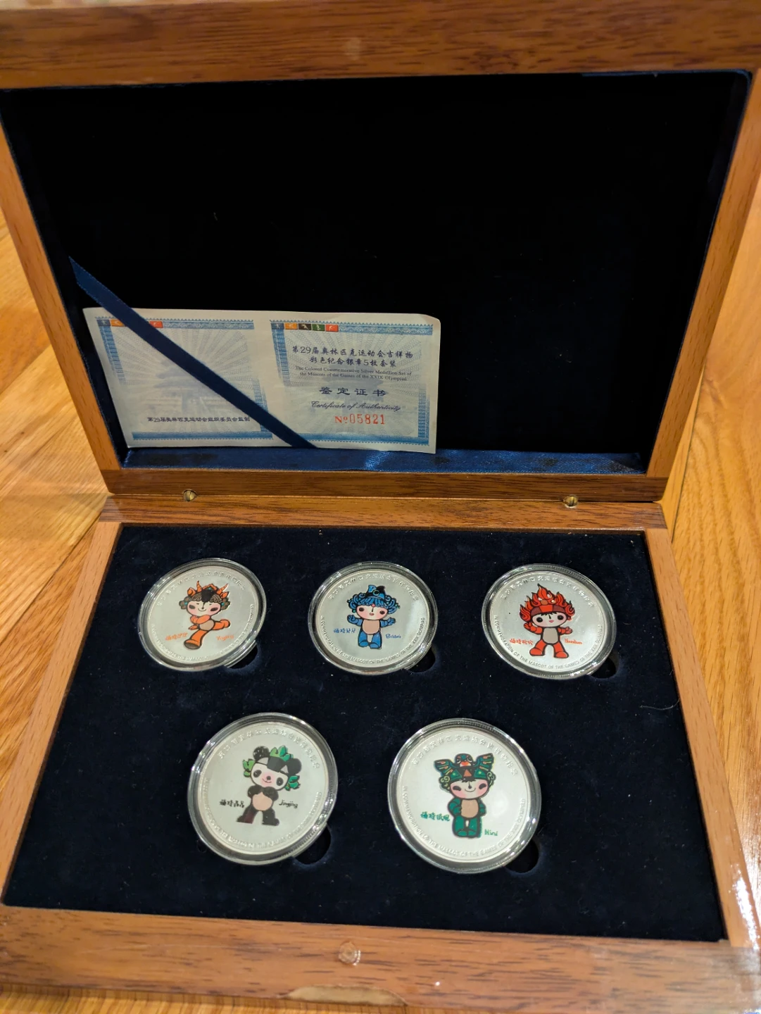 Selling a set of commemorative coins from the Beijing 2008 Olympics. The coins feature the mascots of the games and come in a wooden box. The set includes a certificate of authenticity.