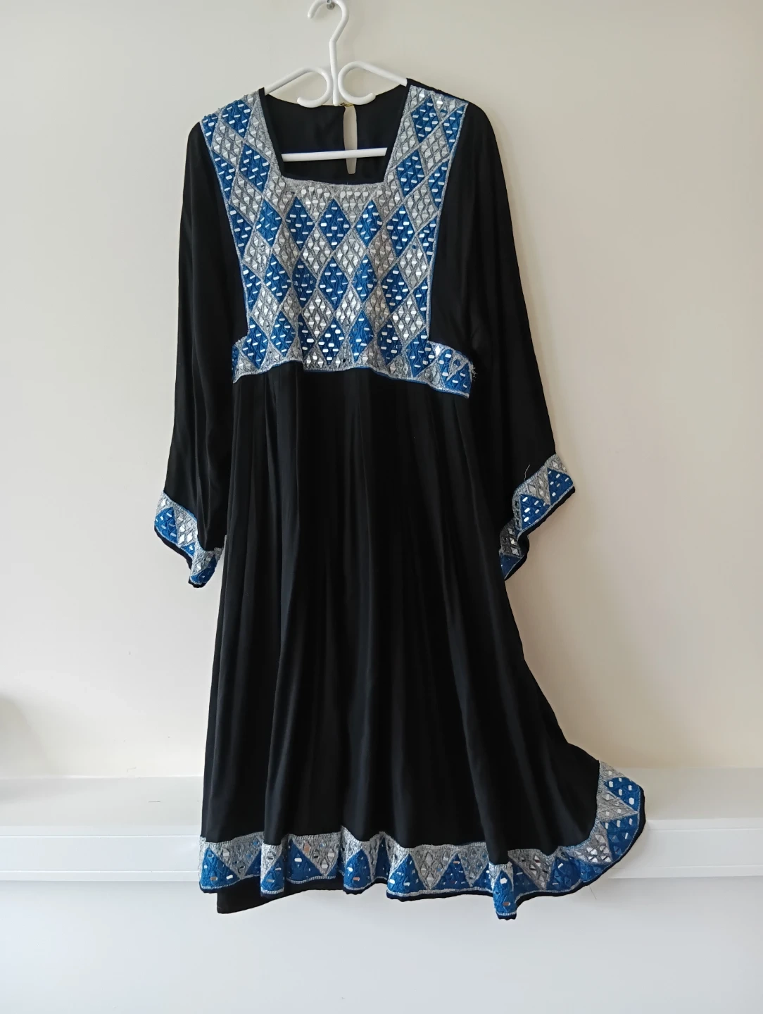 Black dress featuring intricate blue and silver geometric embroidery on the neckline and sleeves. The hem also has a coordinating embroidered border. It's a stylish piece for various occasions.