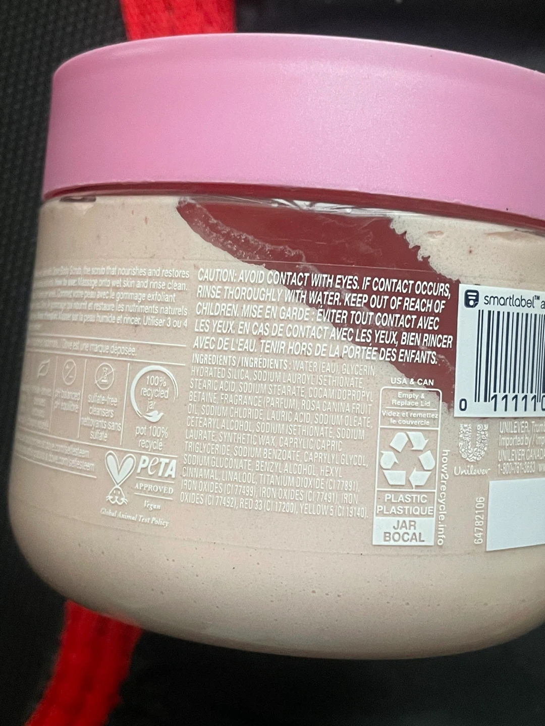Dove nourishing body scrub. Leaves skin feeling soft and cleansed. Contains rose oil and a hint of rose petal. Exfoliates and nourishes skin.