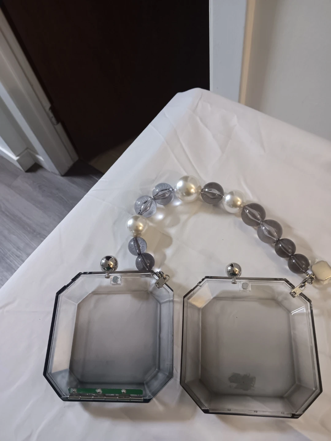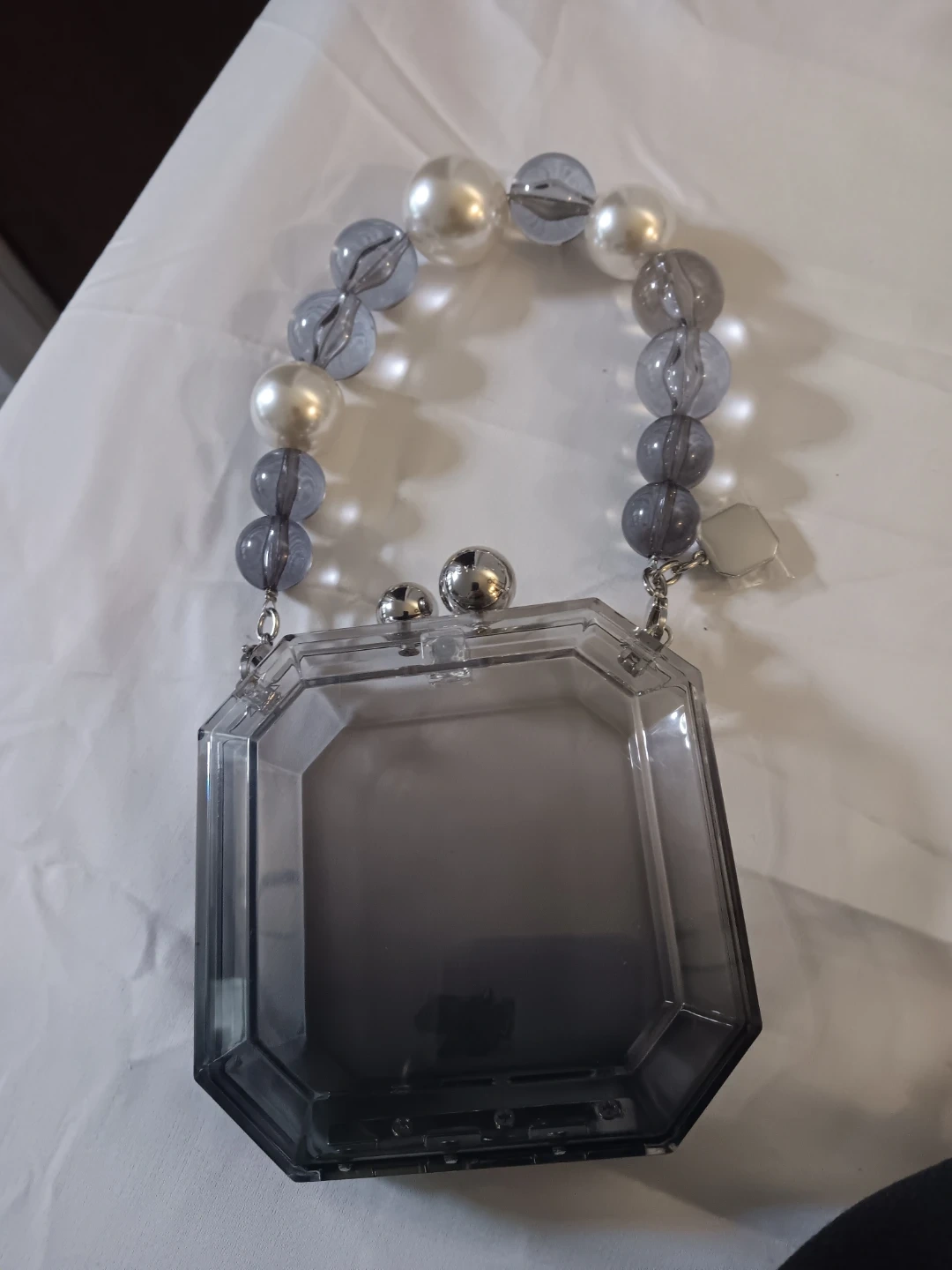 This unique clutch features a smoky grey acrylic octagonal shape with a distinctive handle made of pearl and clear beads. It's perfect for adding a statement piece to any outfit for a night out or special occasion. The closure is a secure clasp, and the acrylic construction offers a modern look.