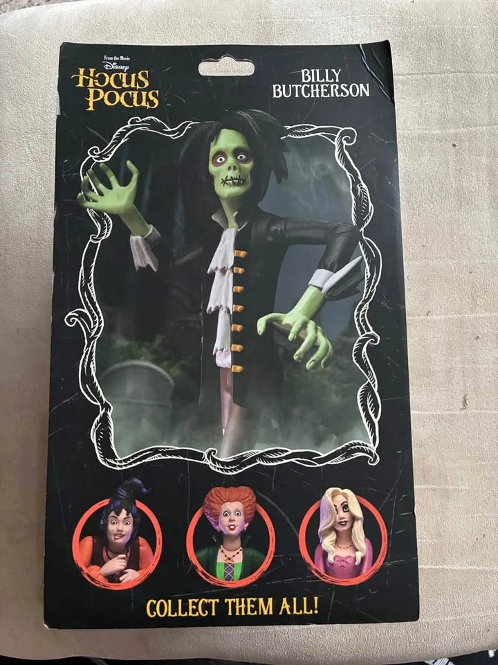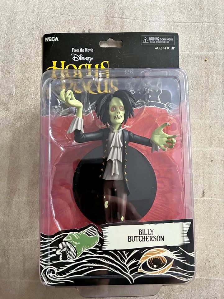 This is a 6-inch scale action figure from the movie Hocus Pocus. Stands at a 6-inch scale and is highly stylized to resemble a Saturday morning cartoon character. Made of PVC plastic and manufactured in 2022. Comes in collector-friendly blister card packaging with a bonus cutout backdrop. Minor card crease in top left.