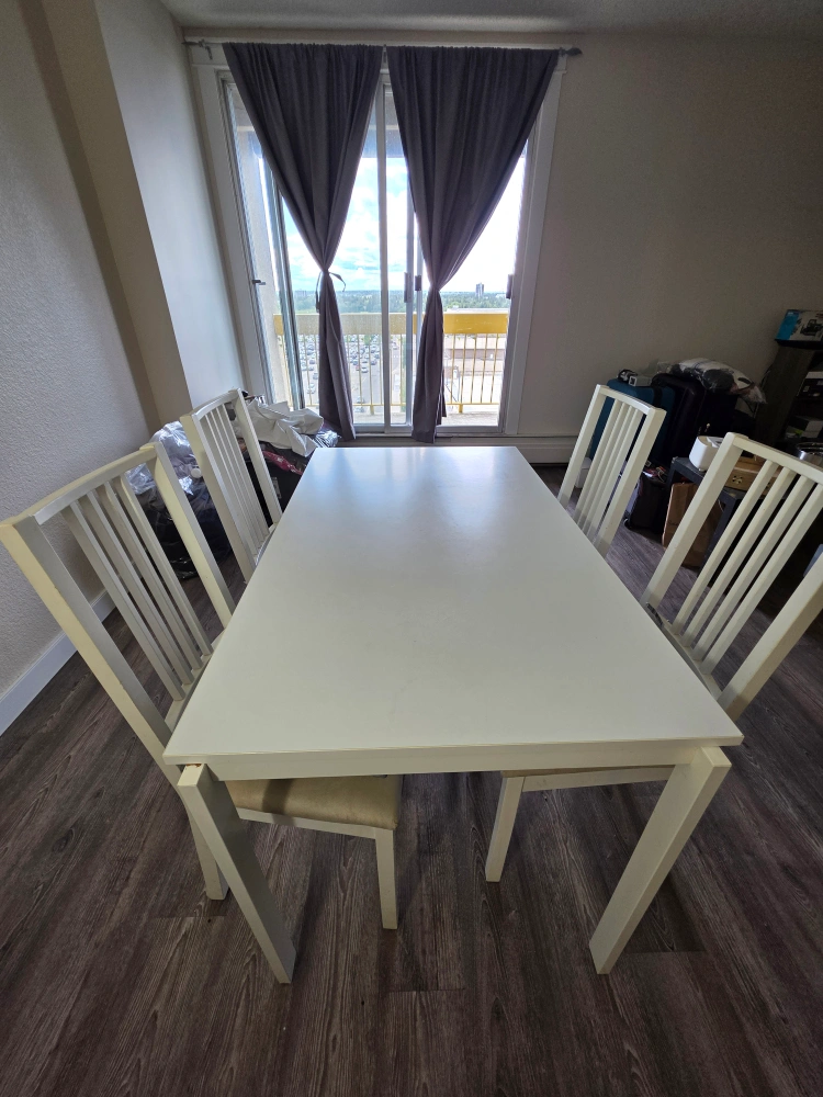 Selling a dining table with four chairs! It's in great condition and perfect for a small dining area or kitchen. The set is white, which makes it easy to match with any decor. The chairs have a comfortable seat and a classic design. Message me if you're interested!