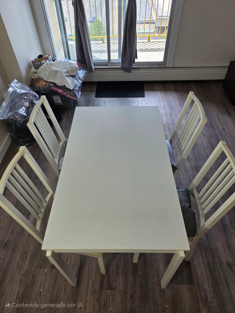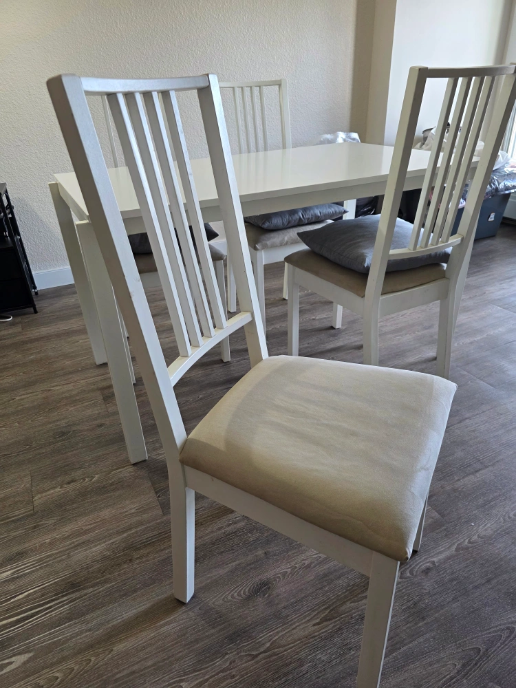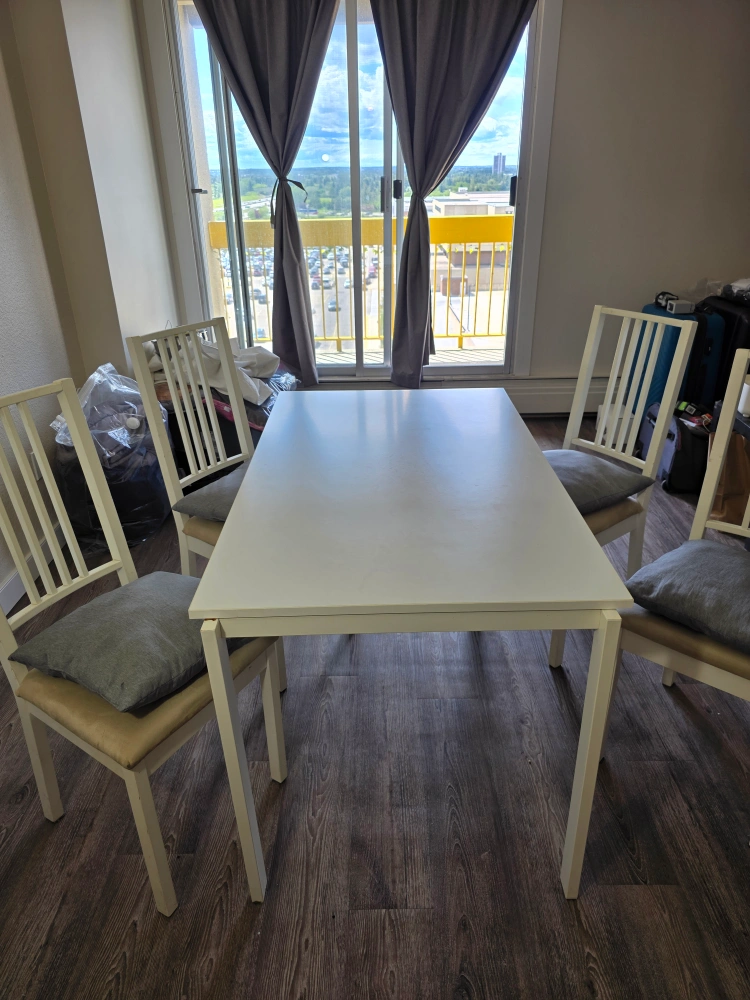 Selling a dining table with four chairs! It's in great condition and perfect for a small dining area or kitchen. The set is white, which makes it easy to match with any decor. The chairs have a comfortable seat and a classic design. Message me if you're interested!