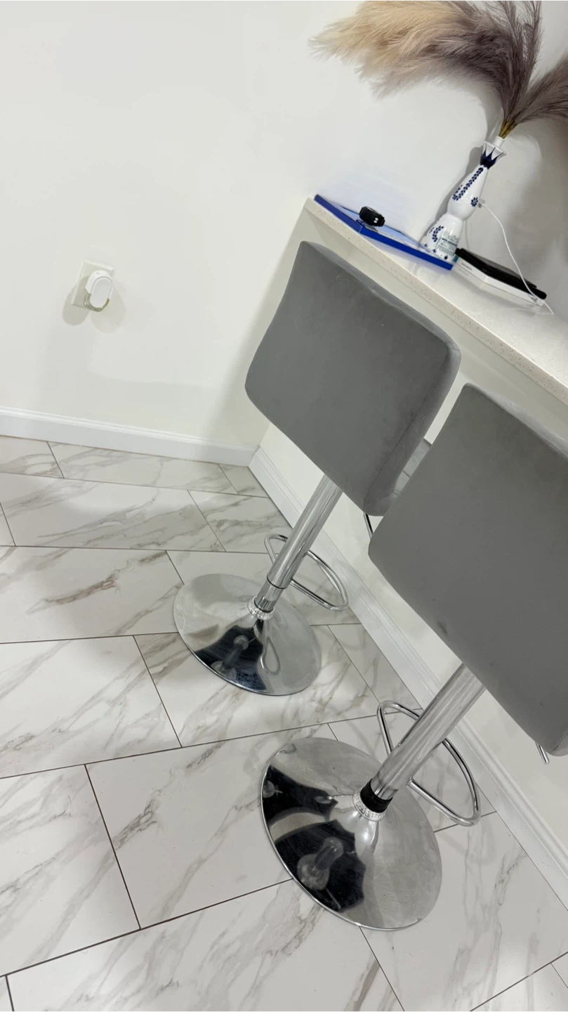 Selling a set of two gray velvet bar stools! They're in great condition and would look lovely in any kitchen or bar area. The stools feature a comfortable velvet seat and a sturdy chrome base. Easy to adjust the height to your liking. Perfect for adding a touch of elegance to your home!