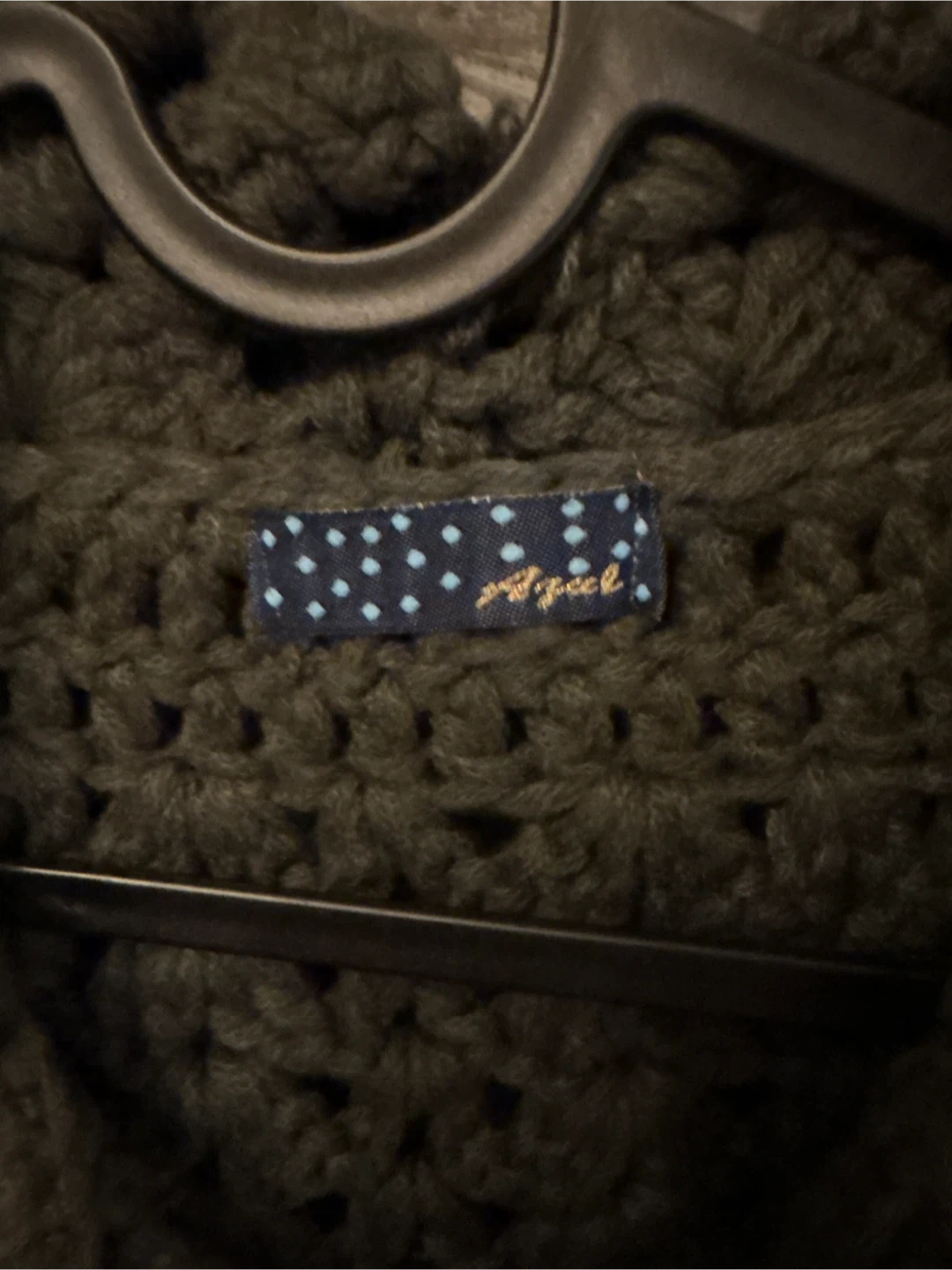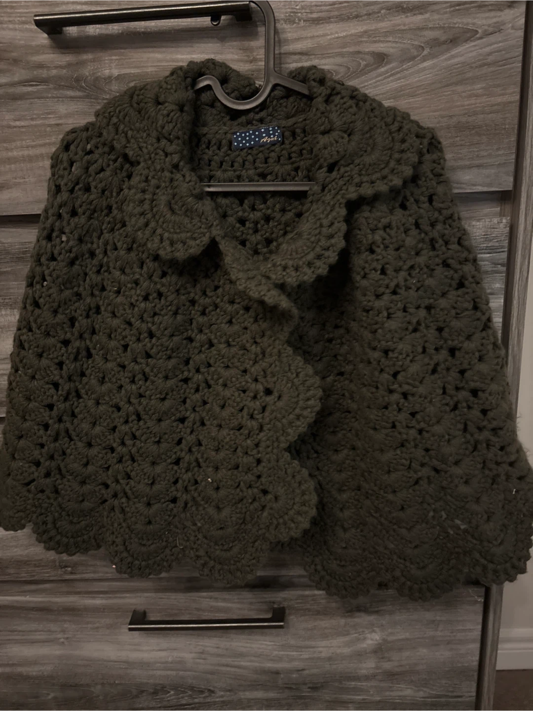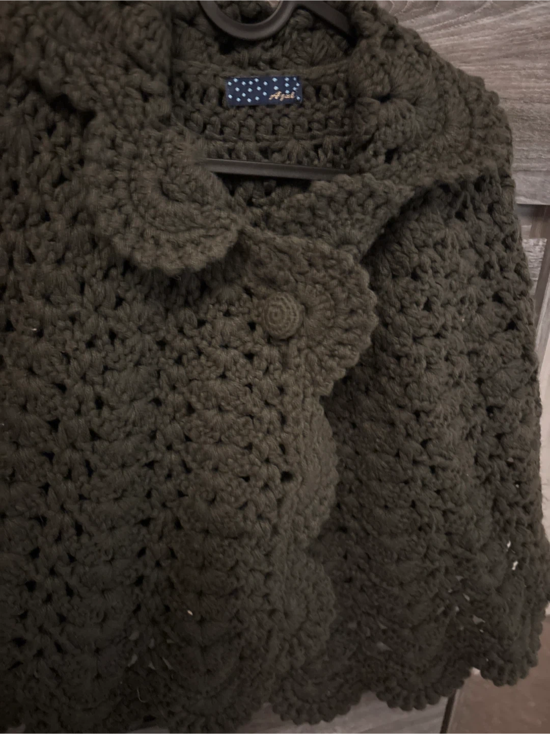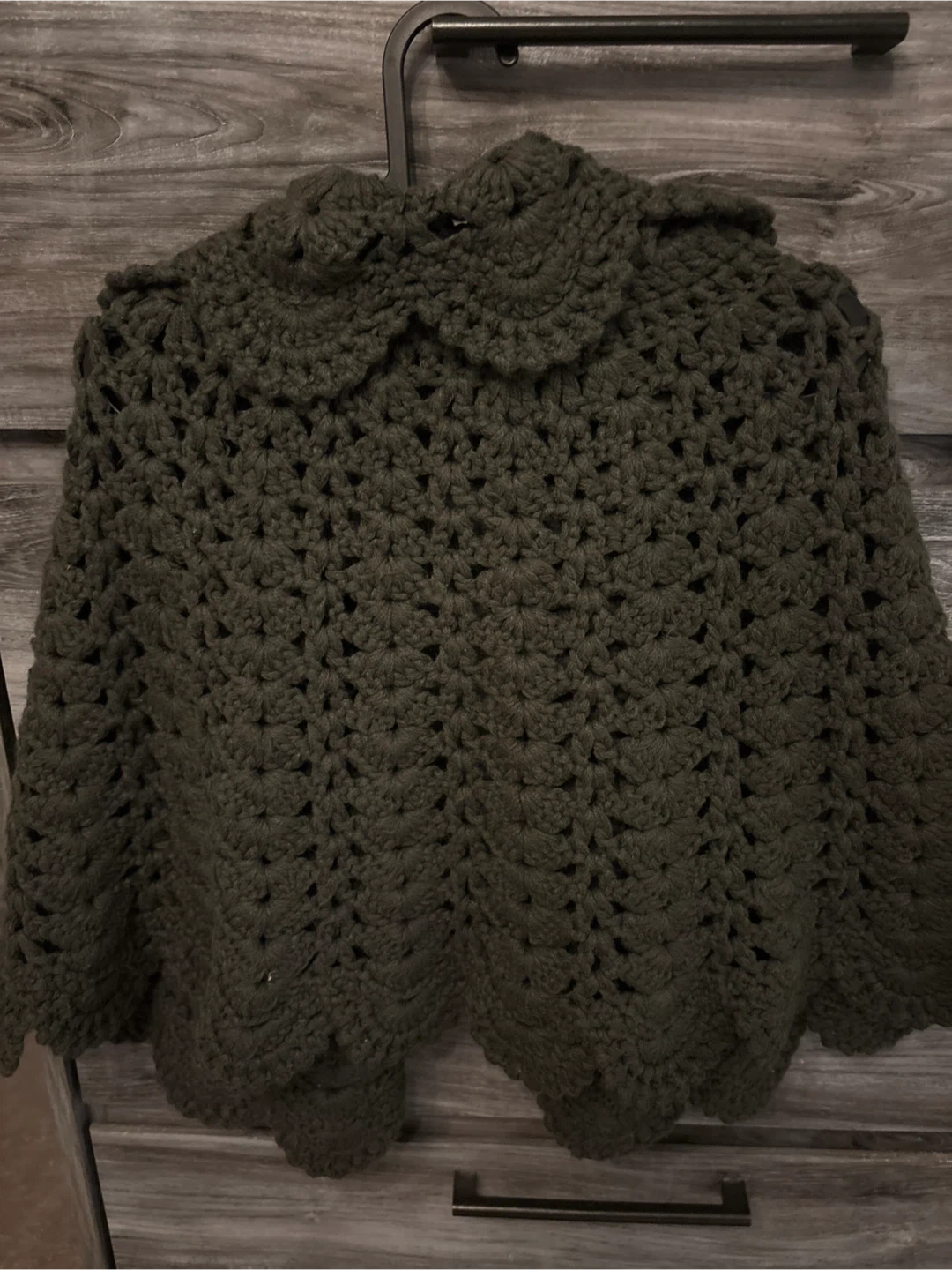 cozy, hand-crocheted cardigan. It's a lovely olive green colour and has a unique scalloped edge. Perfect for layering on cooler days!