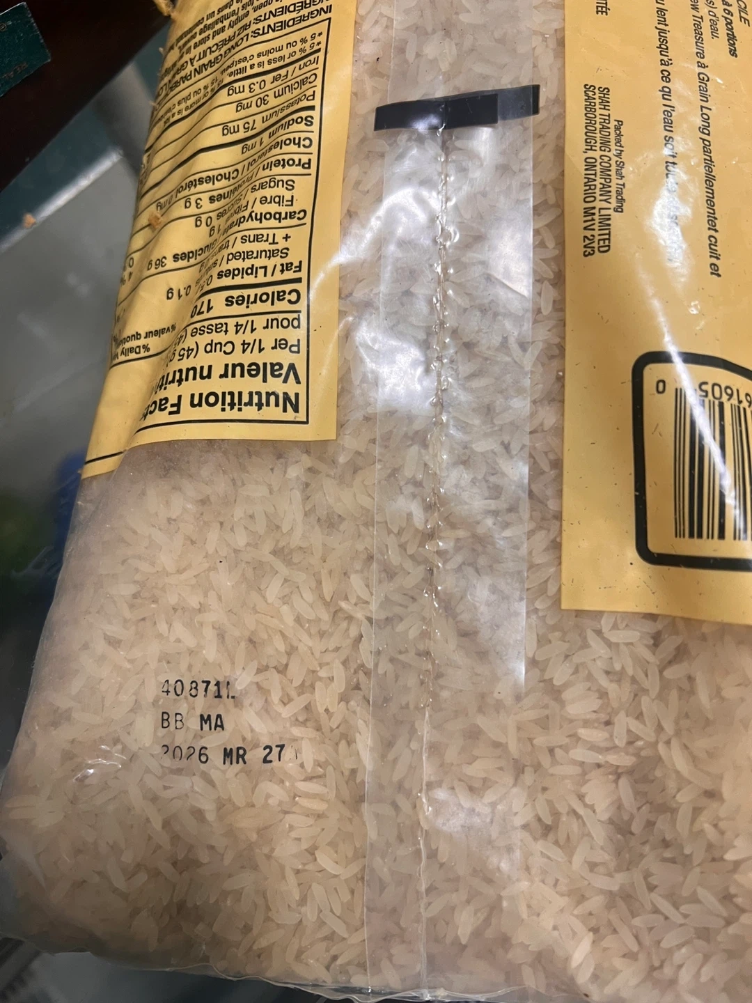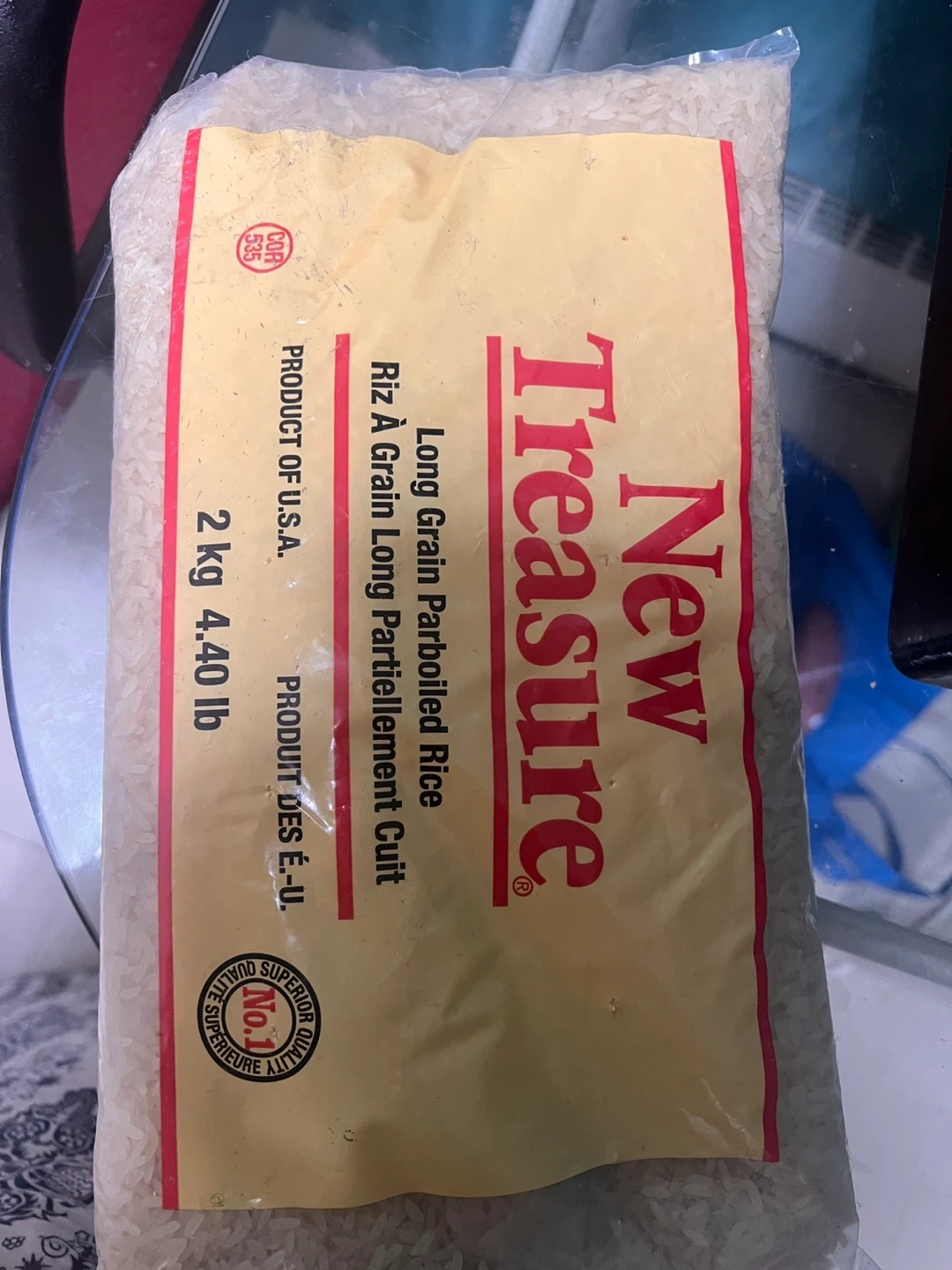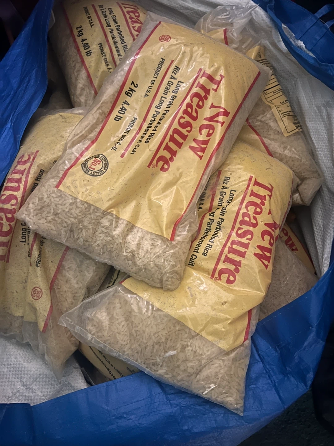 This is a bag of New Treasure Long Grain Parboiled Rice. Each bag contains 2 kg (4.40 lb) of rice. The Best Before date is 2026 MR 27.
