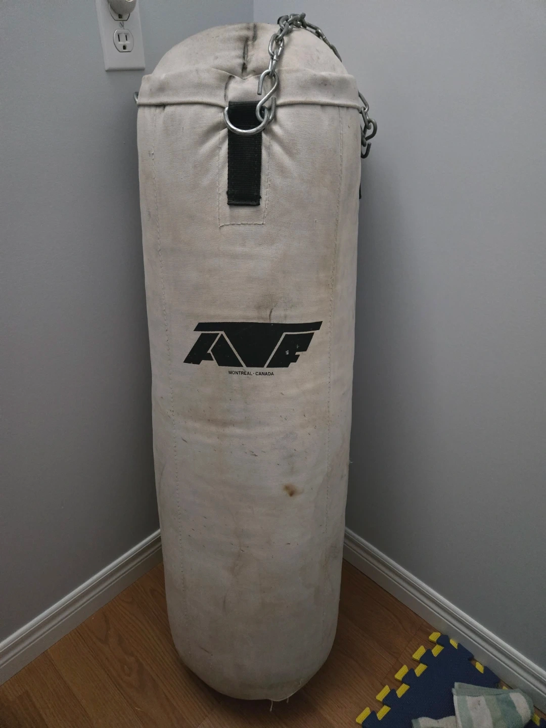 This is an AVF punching bag from Montreal, Canada. It's made of durable canvas and comes with a metal chain for hanging. There are signs of wear, including some marks and small tears on the material, but it's still ready for training.