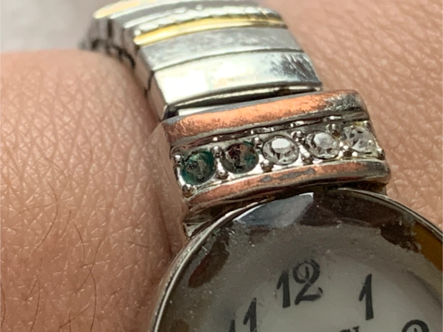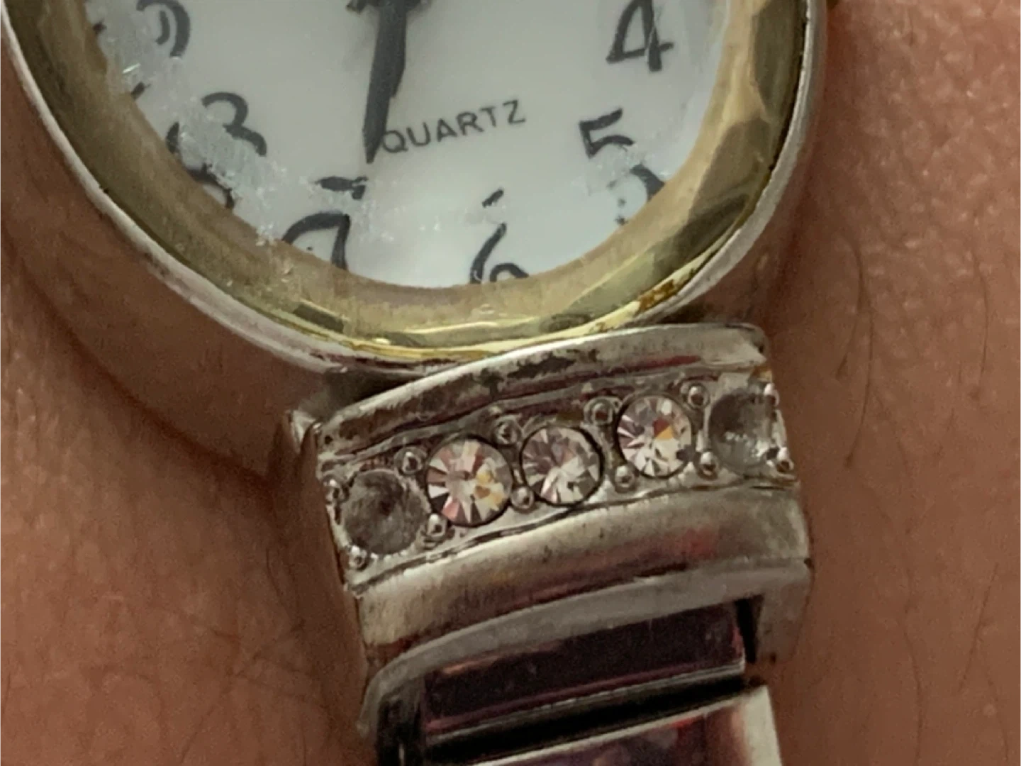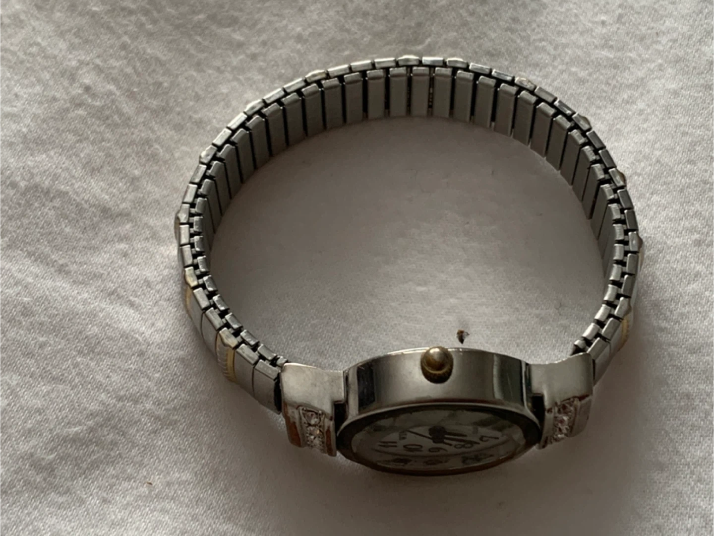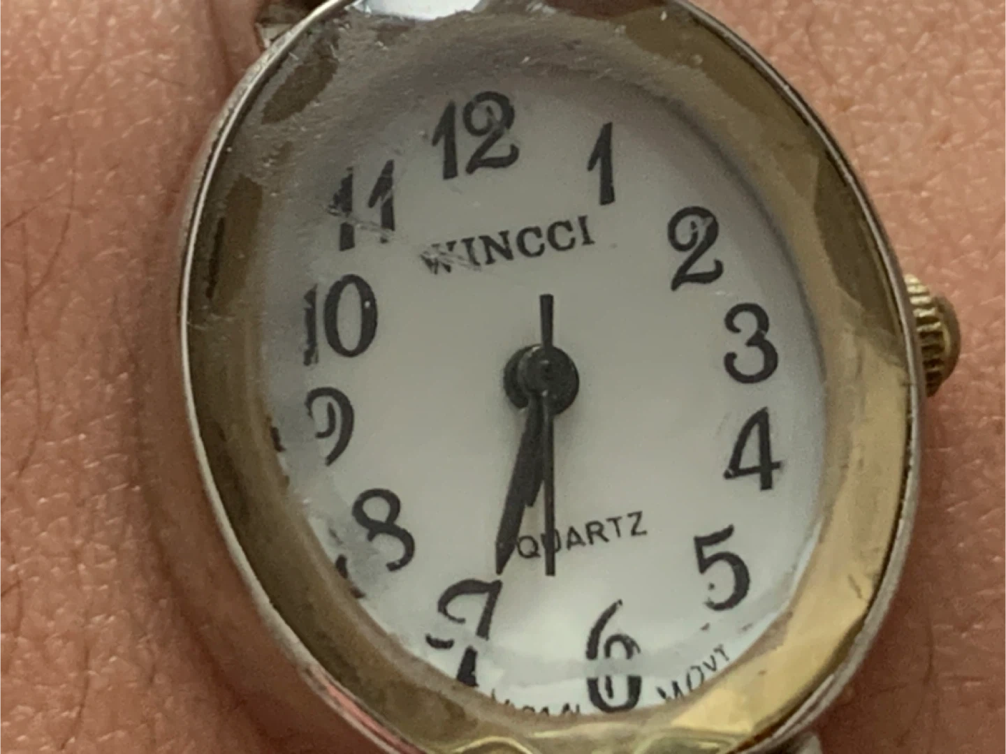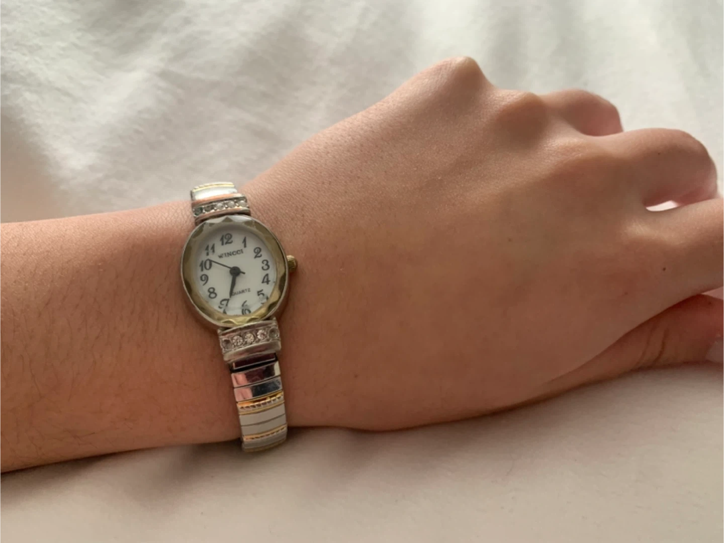 Selling a WINOCCI quartz watch for ladies! It has a silver and gold-tone band with some decorative stones around the watch face. The watch face is white with black numbers.