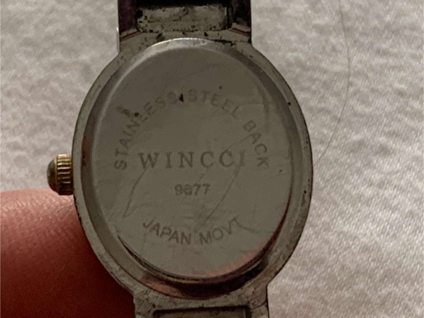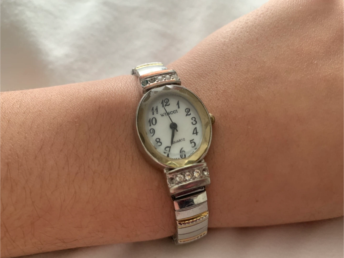 Selling a WINOCCI quartz watch for ladies! It has a silver and gold-tone band with some decorative stones around the watch face. The watch face is white with black numbers.